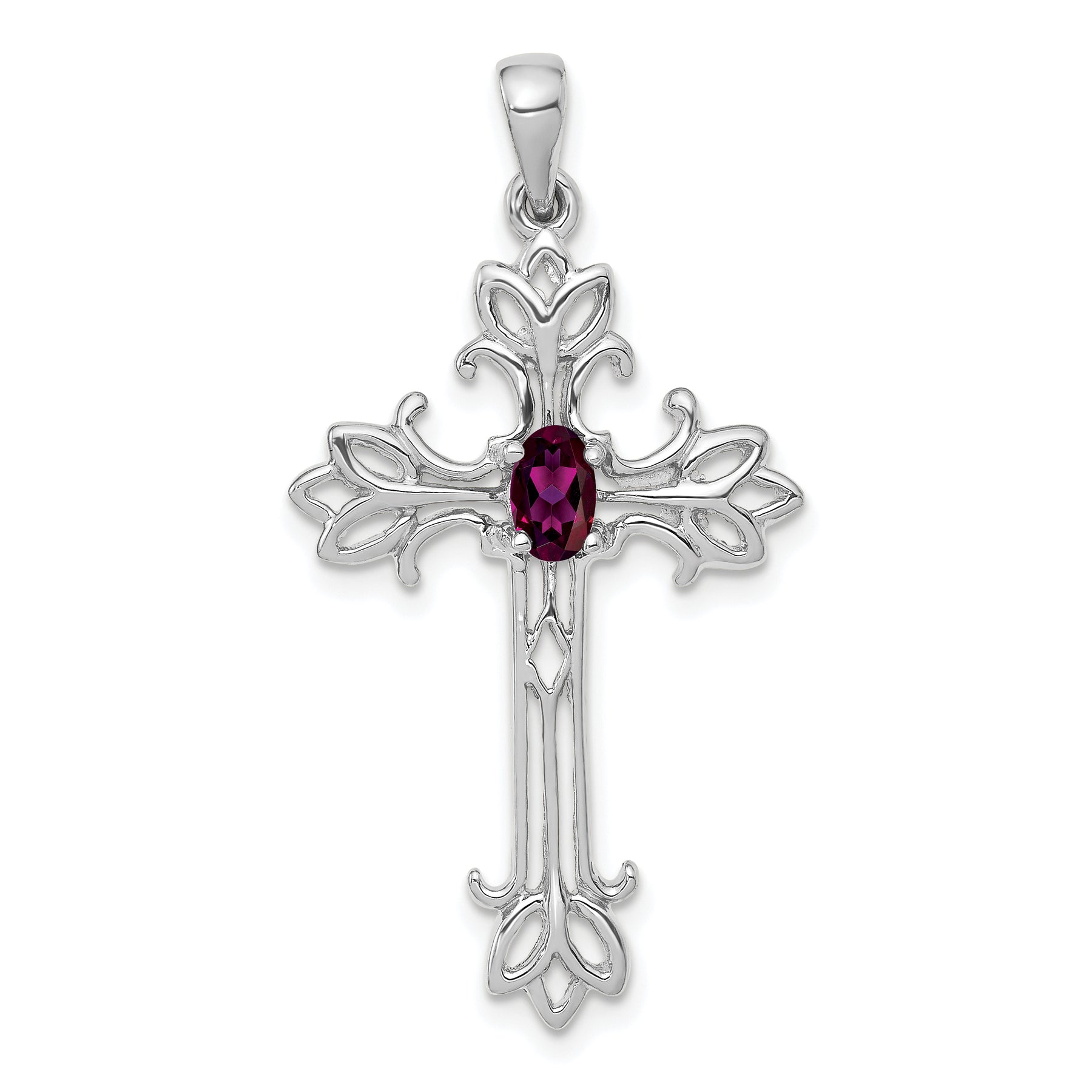 14k White Gold Rhodolite Oval Stone Garnet Design Cross Pendant