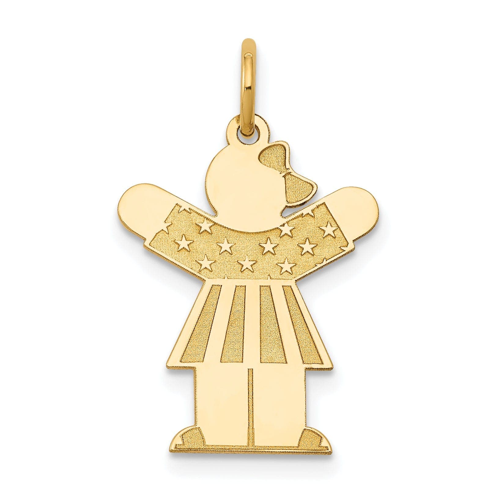 Elevate your jewelry collection with this stunning 14k Yellow Gold Stars Stripes Girl Love Charm. Crafted from high-quality solid polished yellow gold, this charm features laser etched detailing of stars and stripes, creating a whimsical and patriotic design. The charm is delicately designed in the shape of a girl, adding a touch of femininity and charm to the piece.