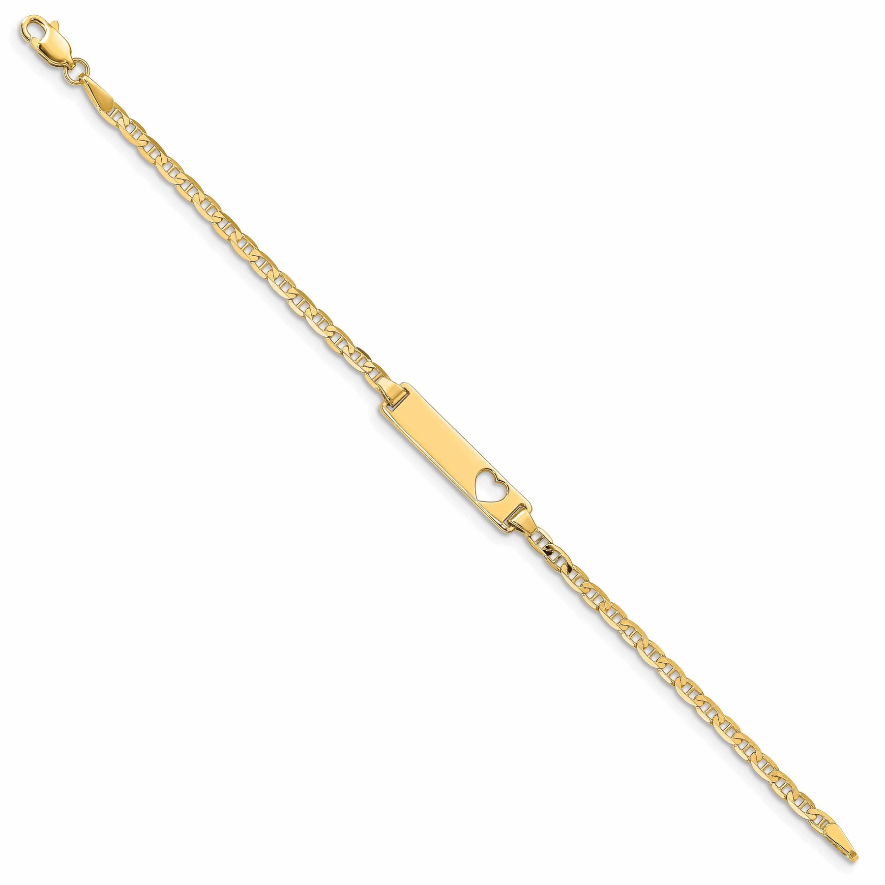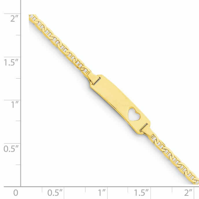 The 14k Yellow Gold Anchor Link Baby ID Plate with Cut out Heart Bracelet is a stunning piece of jewelry that is perfect for any little one. Made from high-quality 14k yellow gold, this bracelet is durable and long-lasting, making it the perfect keepsake for your child.