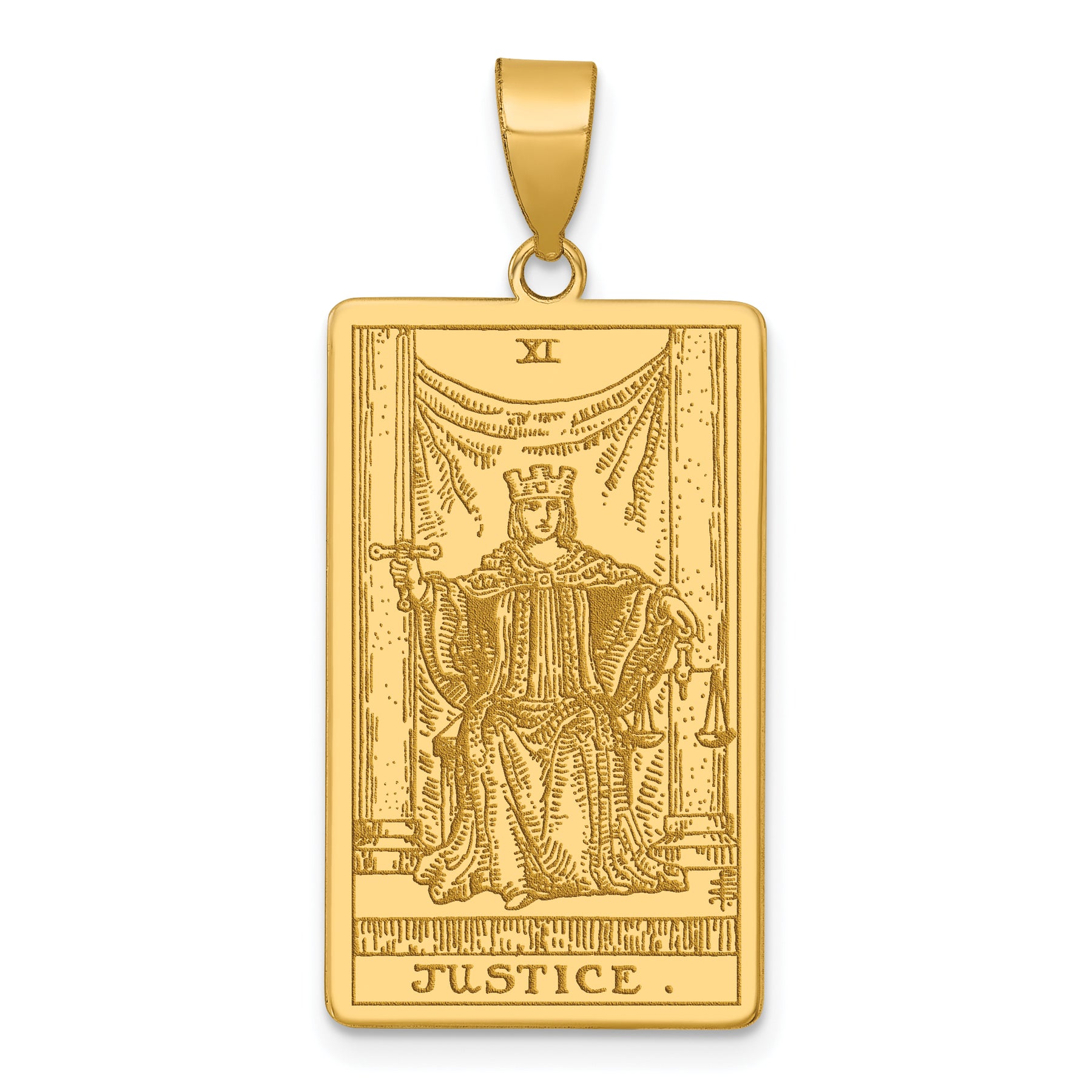 Description tag | Elevate your style with our 14kt Yellow Gold Justice Tarot Card Pendant. This exquisite piece symbolizes balance and fairness, perfect for those who embrace positive energy and spirituality. Ideal for layering or wearing solo, it serves as a striking accent to any outfit. |