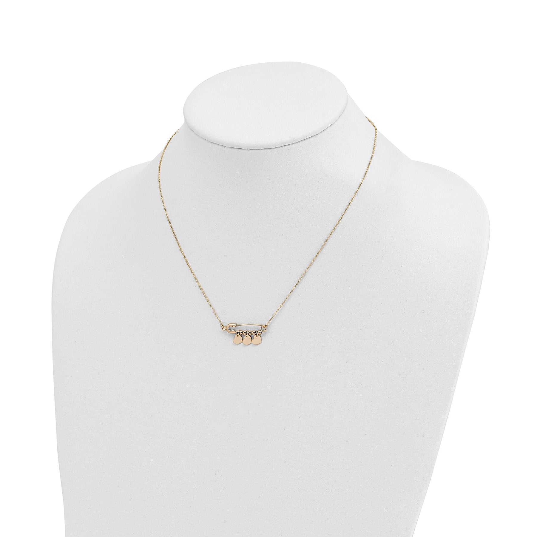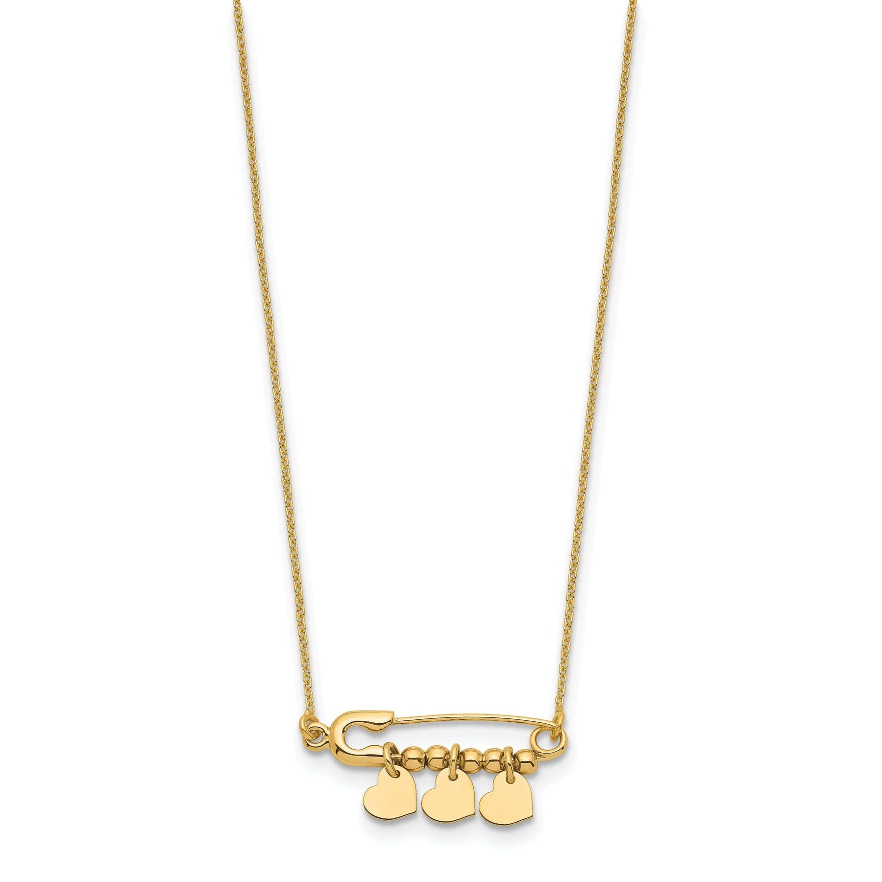 14K Yellow Gold Polished Finish Safety Pin with Dangle 3-Hearts Design with 17-inch Cable Chain Necklace