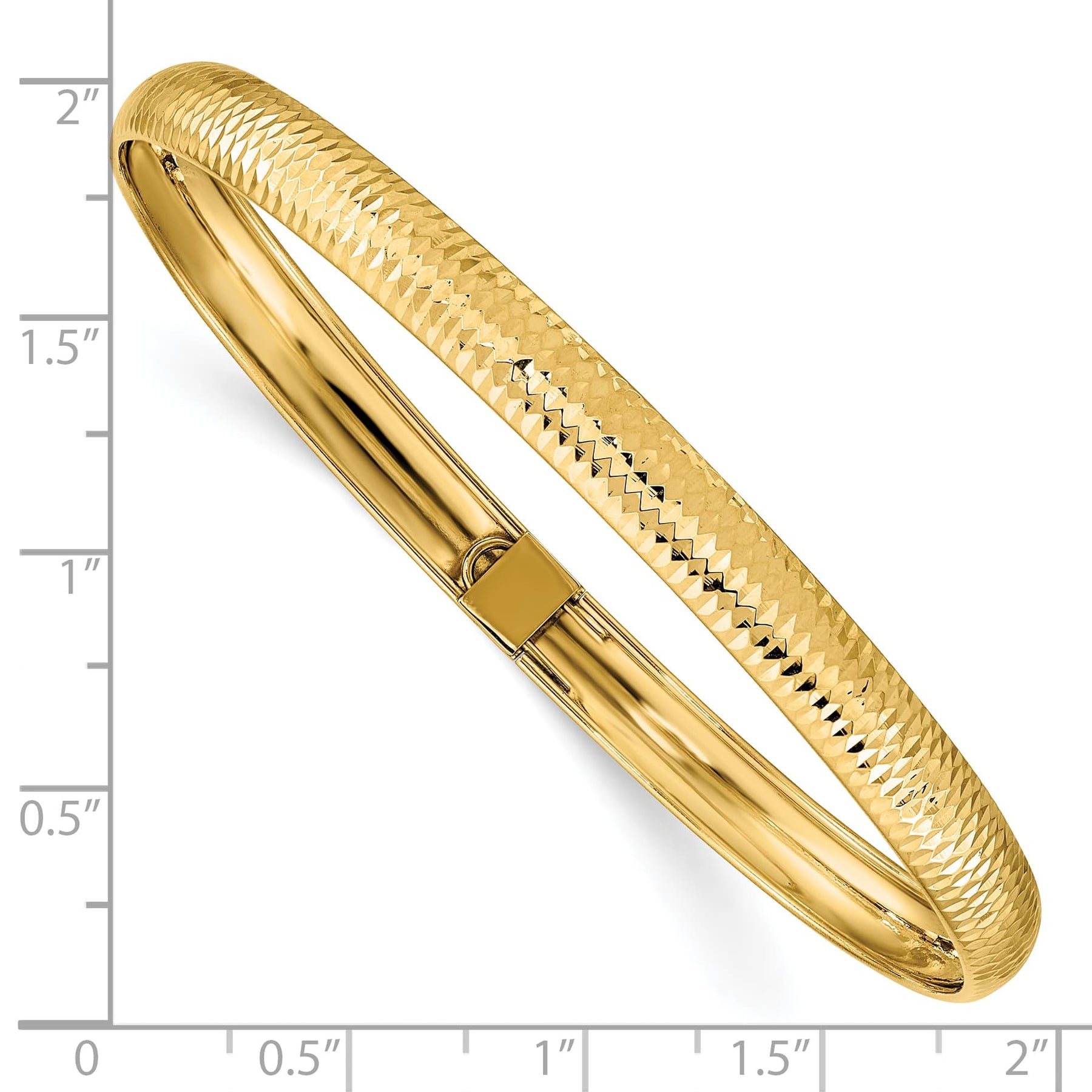 The 10K Yellow Gold 6.15 mm Hinged Bangle is a solid 10K Yellow Gold Textured hinged bangle with a polished finish. Stamped 10K and guaranteed authentic. Features a hinged opening for easy on and off — snap shut for a seamless, secure fit with a polished look all the way around.