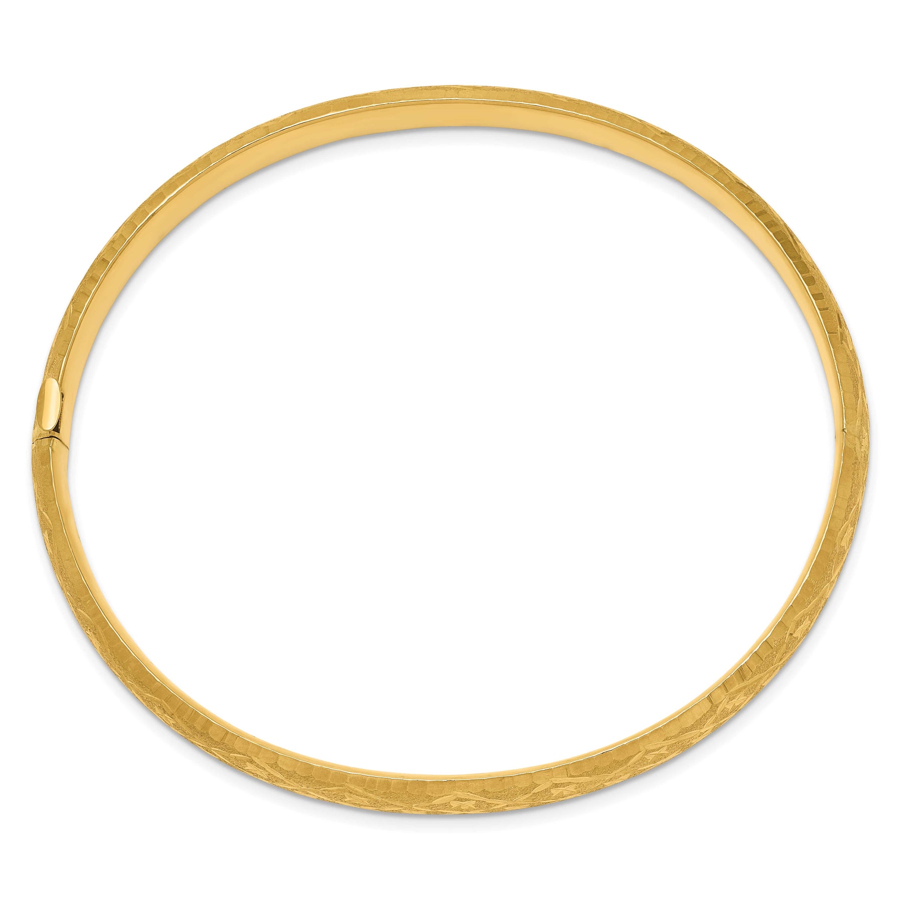 The 10K Yellow Gold 6.5 mm D.C. Polished Hinged Bangle is a solid 10K Yellow Gold Diamond Cut hinged bangle with a polished & brushed finish. Stamped 10K and guaranteed authentic. Features a hinged opening for easy on and off — snap shut for a seamless, secure fit with a polished look all the way around.
