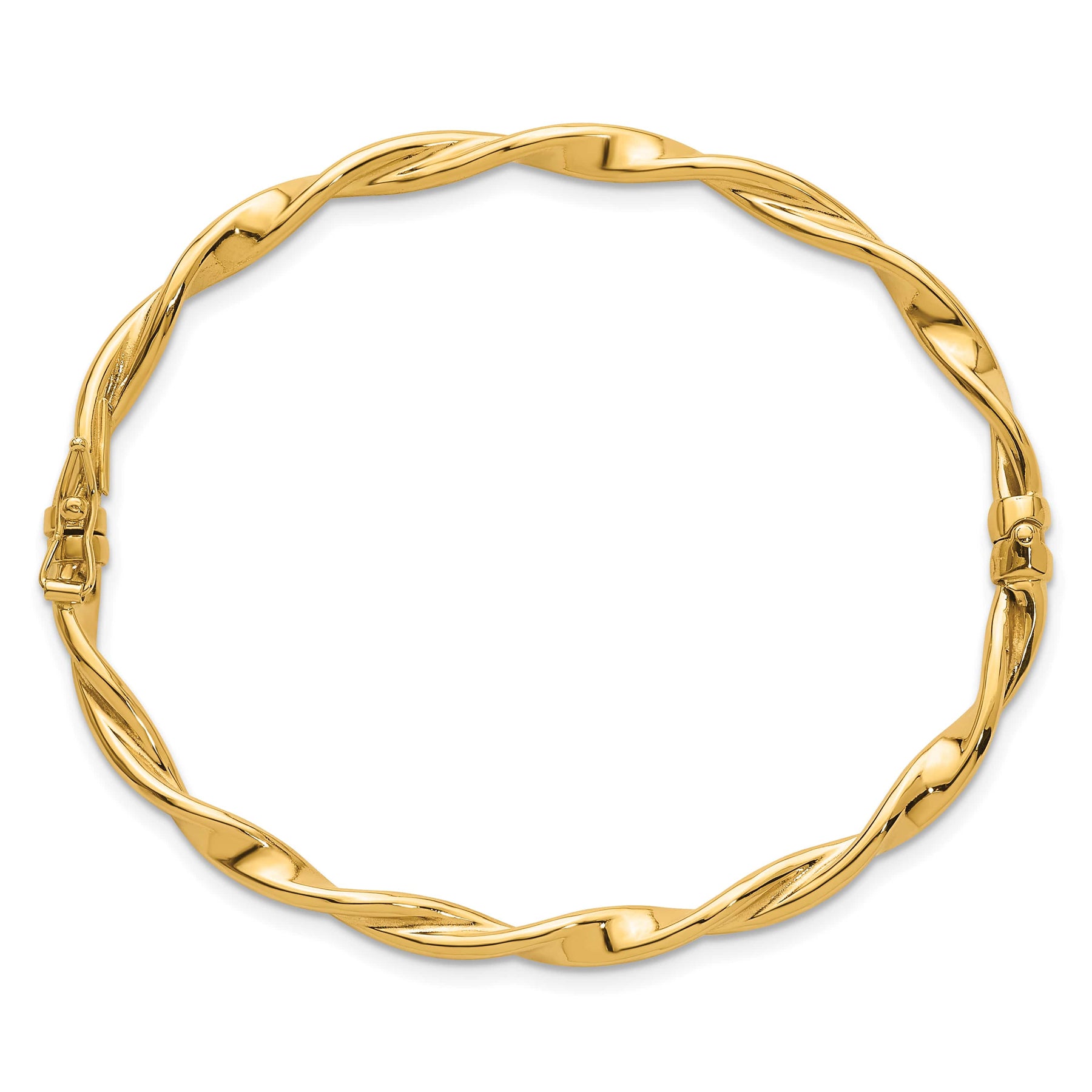 The 10K Yellow Gold Hinged Bangle is a solid 10K Yellow Gold Twisted hinged bangle with a polished finish. Stamped 10K and guaranteed authentic. Features a hinged opening for easy on and off — snap shut for a seamless, secure fit with a polished look all the way around.