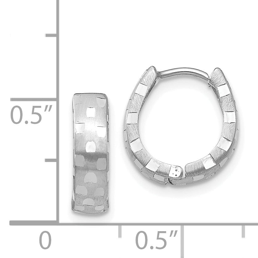 Elevate your style with these stunning 14K White Gold Polished 5mm DC Patterned Hinged Hoop Earrings. Crafted from premium 14K white gold and finished with a lustrous rhodium plating, these earrings feature an elegant diamond-cut texture that adds a touch of sophistication. Weighing just 0.92 grams and measuring 14 mm in length, these solid hoops are the perfect accessory for any occasion. Enjoy the timeless beauty and durability of these must-have earrings.