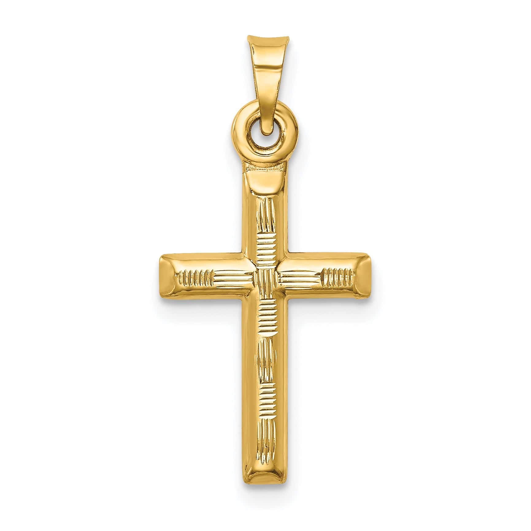 Elevate your jewelry collection with our 14K Yellow Gold Intricate Hollow D.C Latin Cross Pendant. Crafted from solid 14K yellow gold, this beautiful piece features a polished finish and a unique textured design, weighing just 0.43 grams. The pendant measures 37 mm in length and showcases a stunning 3D effect. It includes a durable bail with dimensions of 5.4 mm in length and 2 mm in width, making it perfect for any chain. A timeless expression of faith and style, this pendant is an ideal gift for yourself or a loved one.