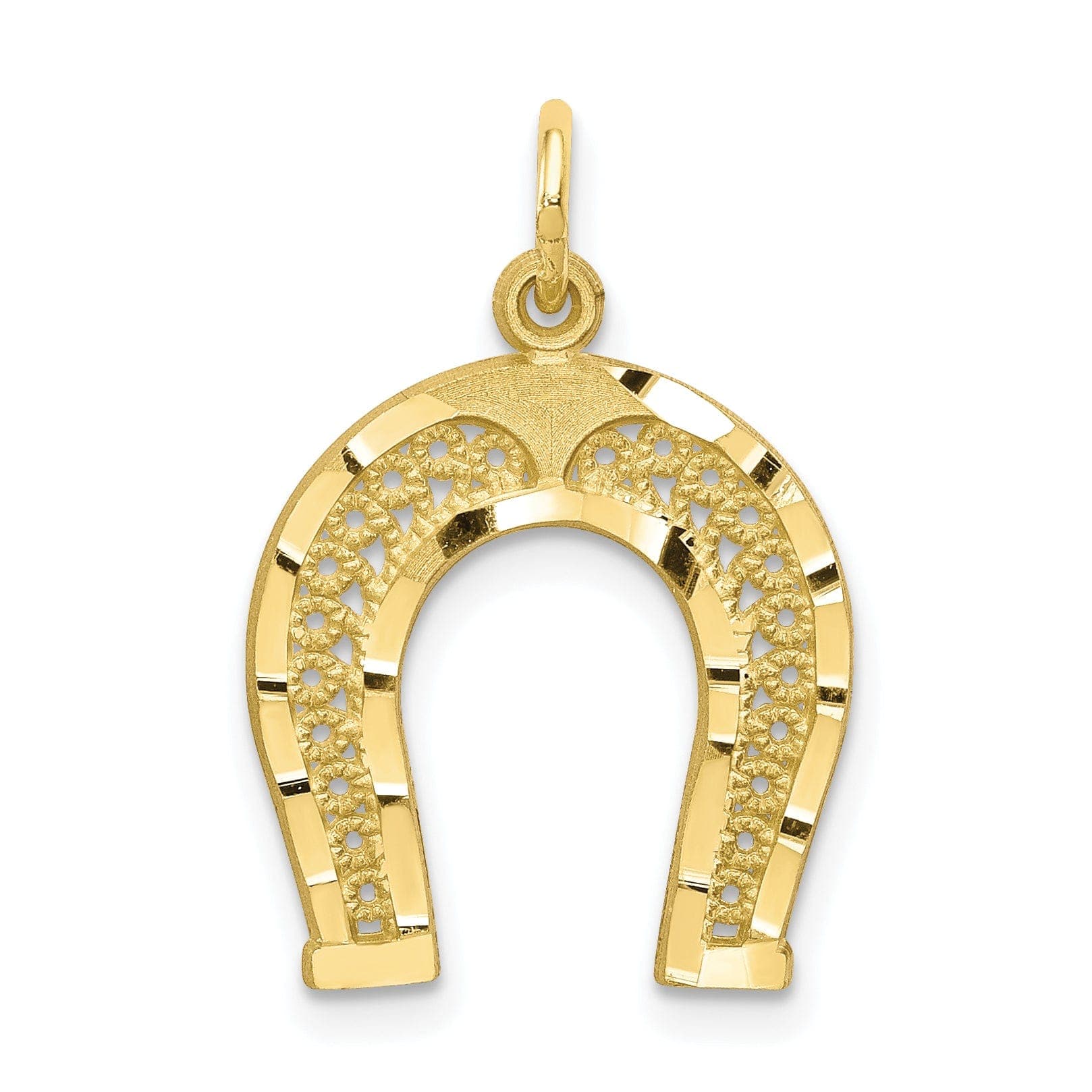 The diamond-cut finish of this horseshoe charm pendant adds a brilliant sparkle and shimmer to your everyday look. The textured design gives it a unique and interesting look, while the polished finish ensures a sleek and sophisticated appearance. Whether you wear it on its own or layered with other necklaces, this pendant is sure to make a statement.