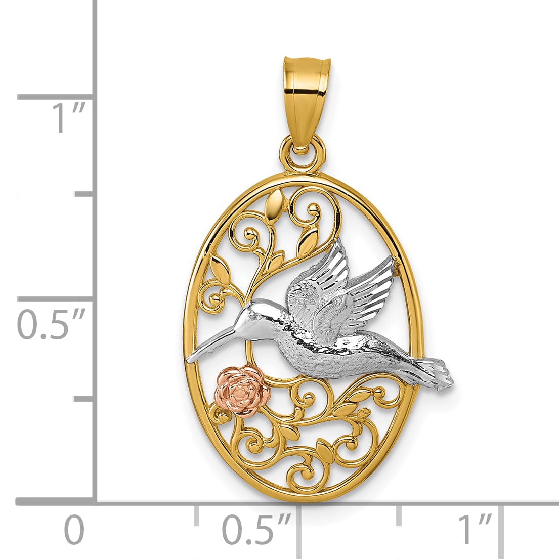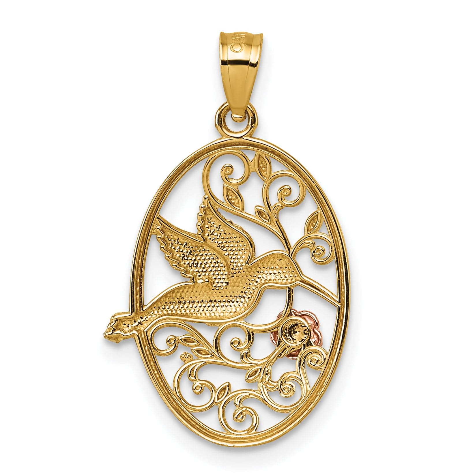 14k TI-Color Gold Hummingbird Flower Filigree Oval Pendant