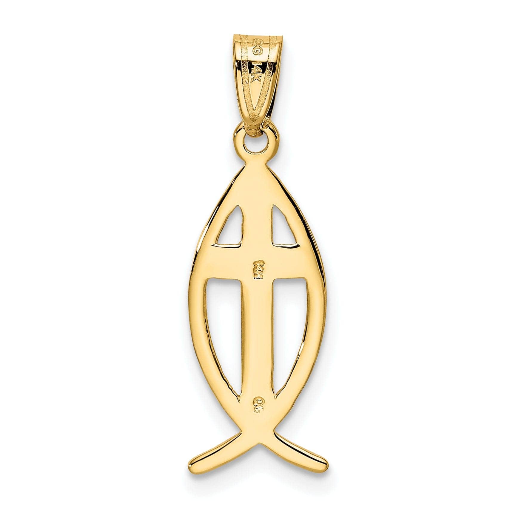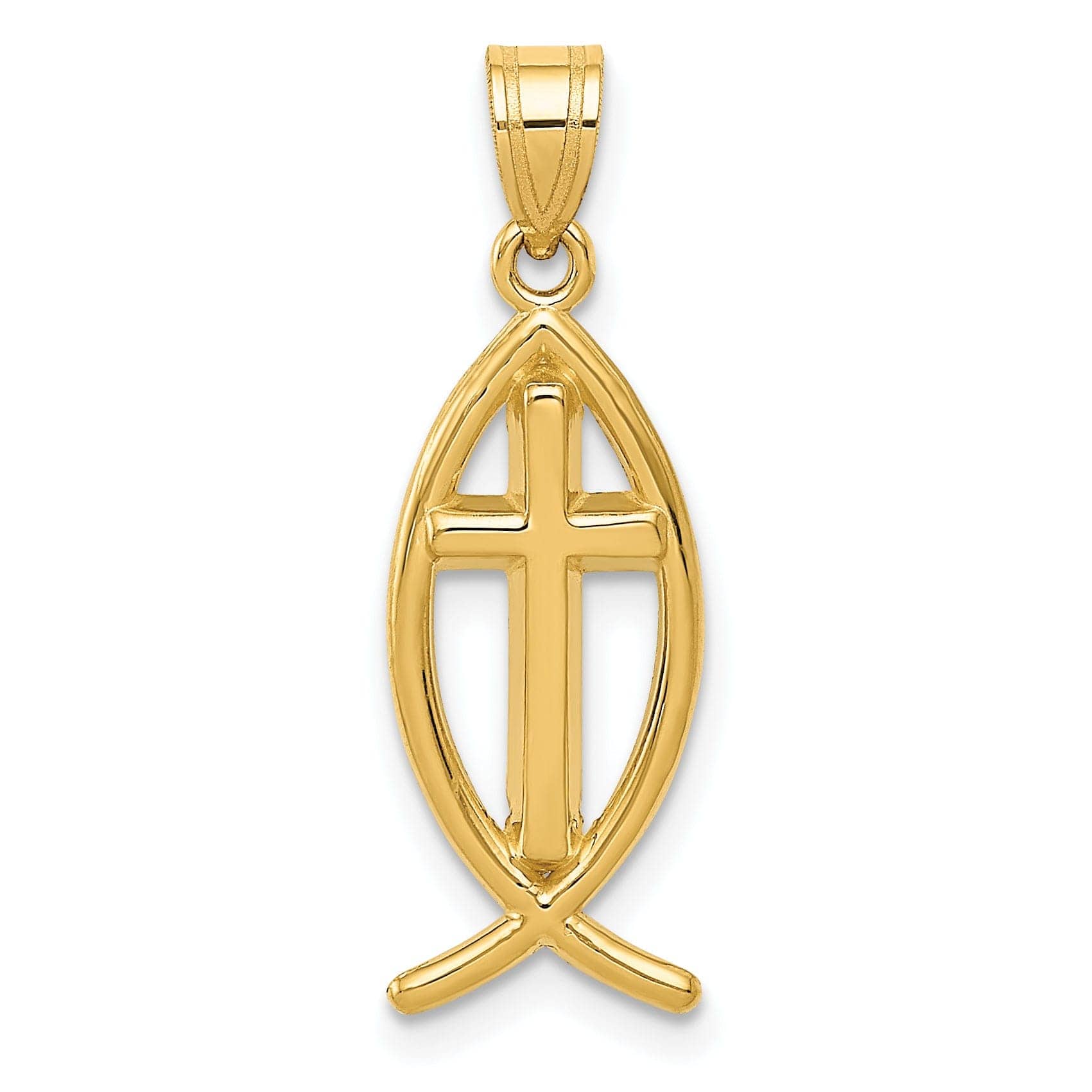 Add a touch of faith and elegance to your ensemble with our 14k Yellow Gold Polished Finish Ichthus Fish with Cross Design Pendant. Capture the essence of your beliefs while making a stylish statement with this beautiful and meaningful piece.