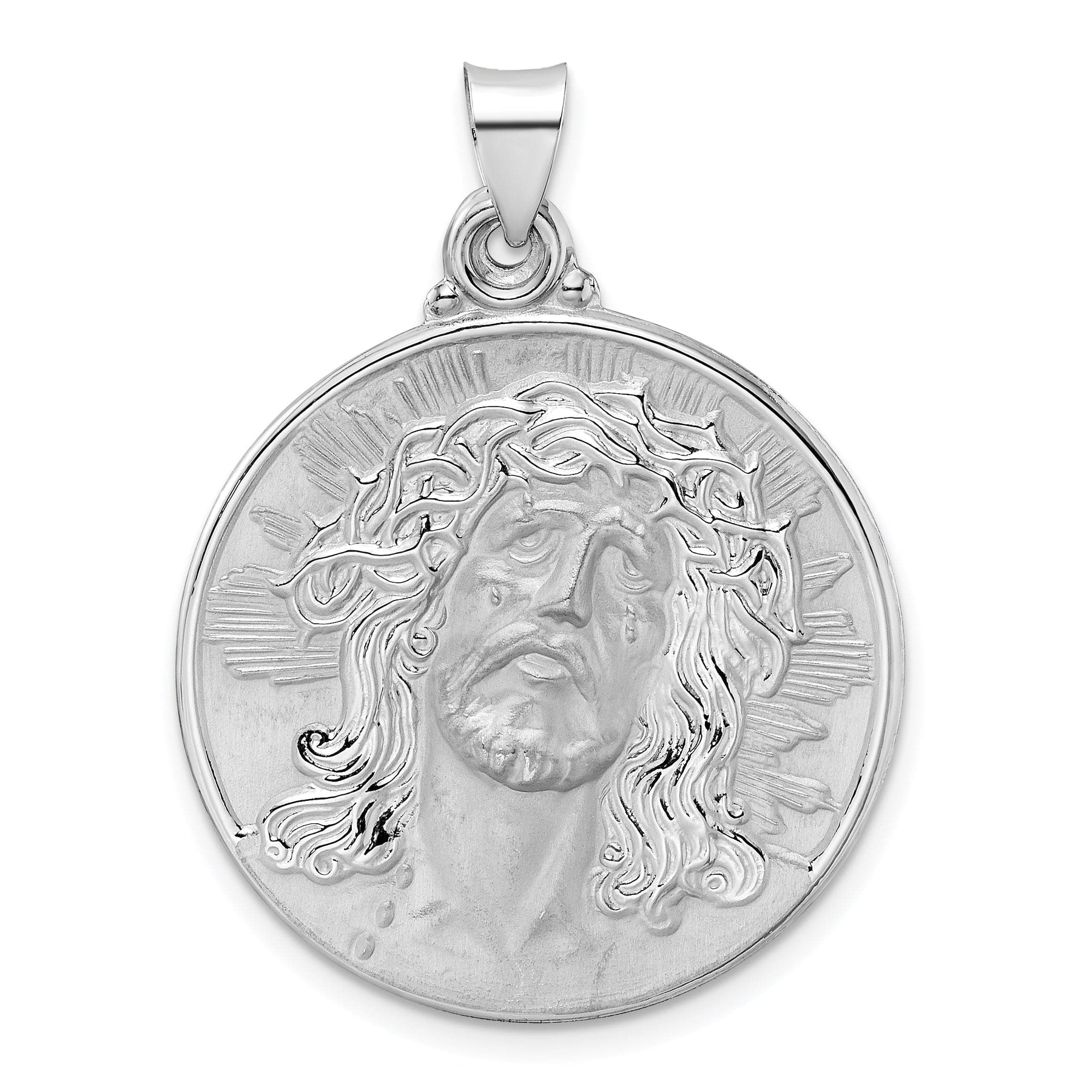 14K White Gold Elegant Rhodium Polished Jesus Face Disc Pendant