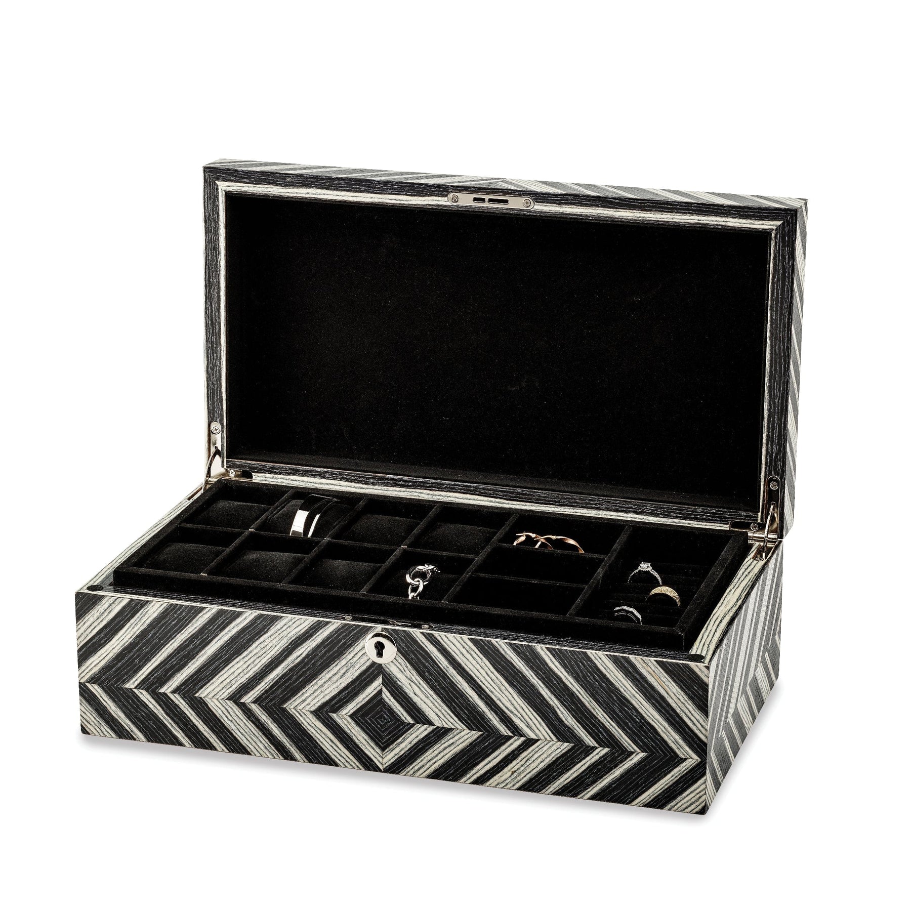 Introducing our exquisite Brazilian Walnut Veneer Locking Jewelry Box, the perfect accessory to store and protect your precious jewels. Crafted from the finest Brazilian Wild Walnut veneer, this jewelry box exudes elegance and sophistication.