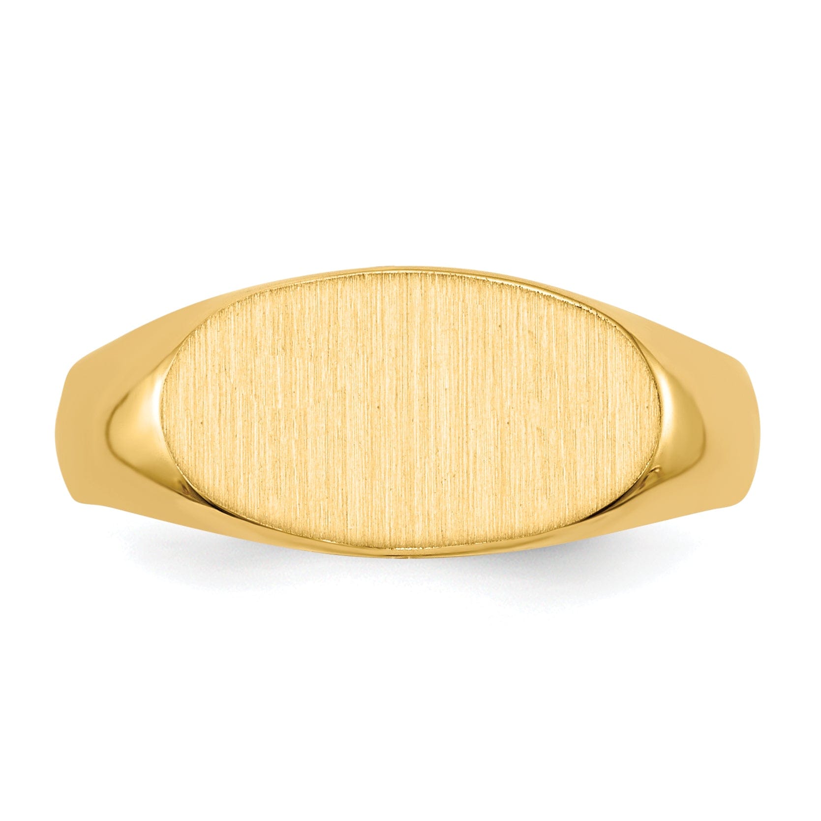With its rich yellow gold color and expert craftsmanship, this ring is a luxurious addition to any outfit. Treat yourself or someone special to this exquisite piece of jewelry that will be treasured for years to come. Make a statement with this elegant and timeless 14k Yellow Gold Open Back Signet Ring.
