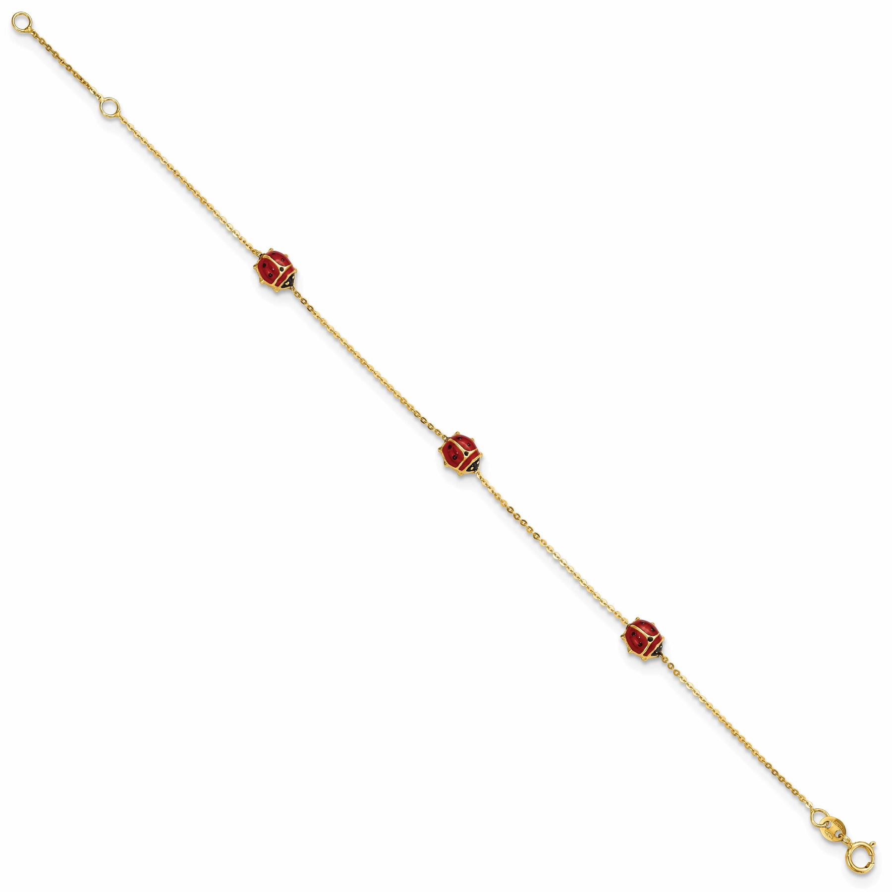 Add a touch of whimsical charm to your outfit with our stunning 14k Yellow Gold 3-Lady Bug Design 6.5-inch Bracelet. Crafted from high-quality 14k yellow gold, this beautiful bracelet features a playful red enamel 3-ladybug design that is sure to turn heads.