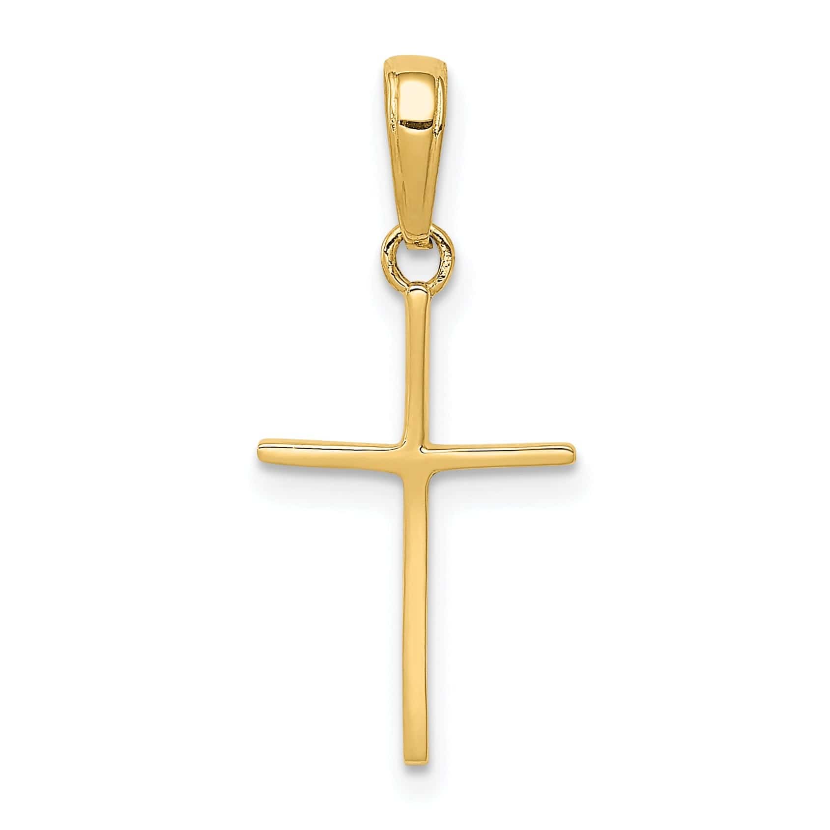 Elegantly crafted from radiant 14k yellow gold, this Polished Cross Pendant is a timeless piece that embodies both faith and fashion. With an average weight of 0.58 grams, this pendant has a delicate yet sturdy feel. The length of the item measures 24 millimeters, while the width is 12 millimeters, making it the perfect size to wear on its own or layered with other necklaces. The sleek and smooth polished finish gives this cross pendant a modern and sophisticated look, making it suitable for everyday wear or special occasions. Whether you're looking to show off your religious beliefs or simply add a touch of elegance to your outfit, this 14k Yellow Gold Polished Cross Pendant is the ideal accessory for any style.