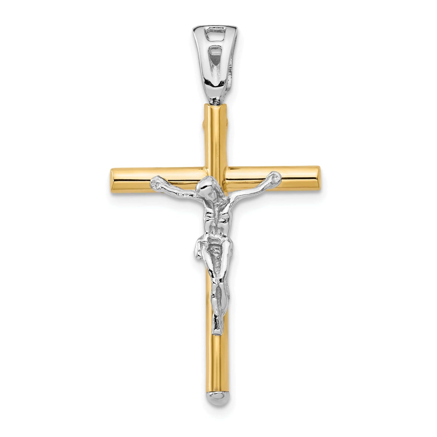 Add a touch of faith and style to your jewelry collection with Leslie's 14k Two Tone Gold Polished Finish Crucifix Pendant. This timeless piece is perfect for everyday wear and also makes a meaningful gift for a loved one on a special occasion. Order yours today and elevate your accessories game with this beautiful pendant.