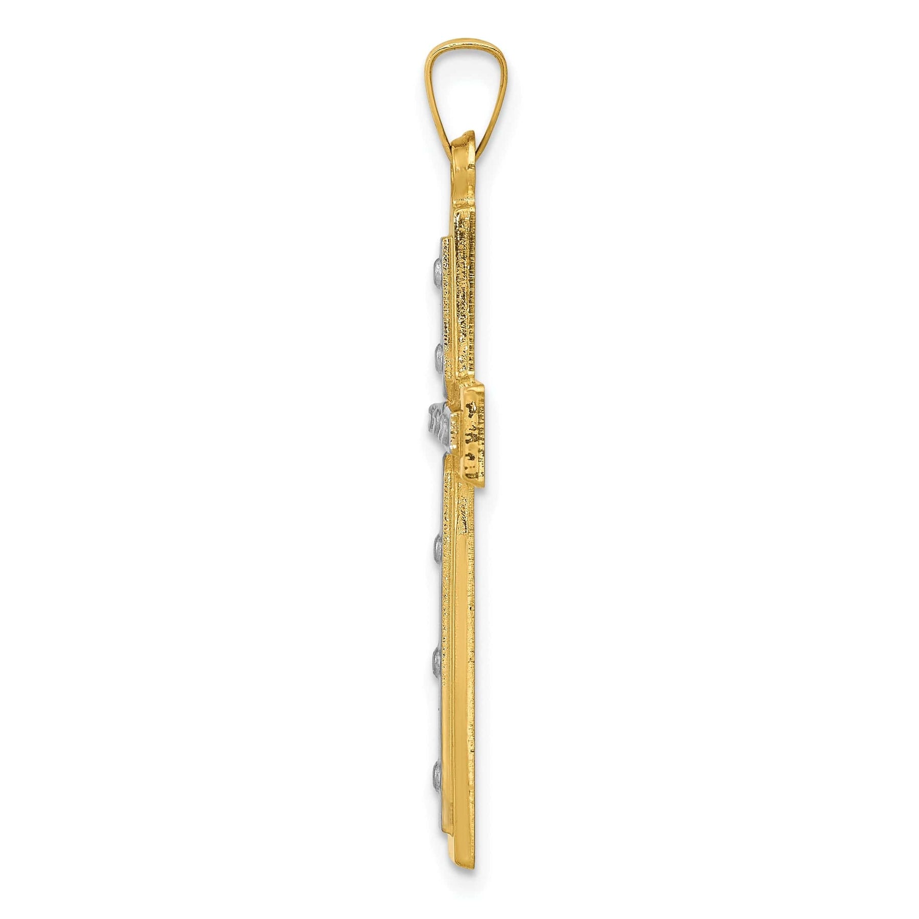 Elevate your style with this stunning 14k Two Tone Gold Screw Design Cross Pendant. Made from high-quality 14k gold with a rhodium polished and satin finish, this beautifully crafted pendant exudes elegance and sophistication. The unique screw design on the flat back of the cross adds a modern touch to this classic symbol of faith.