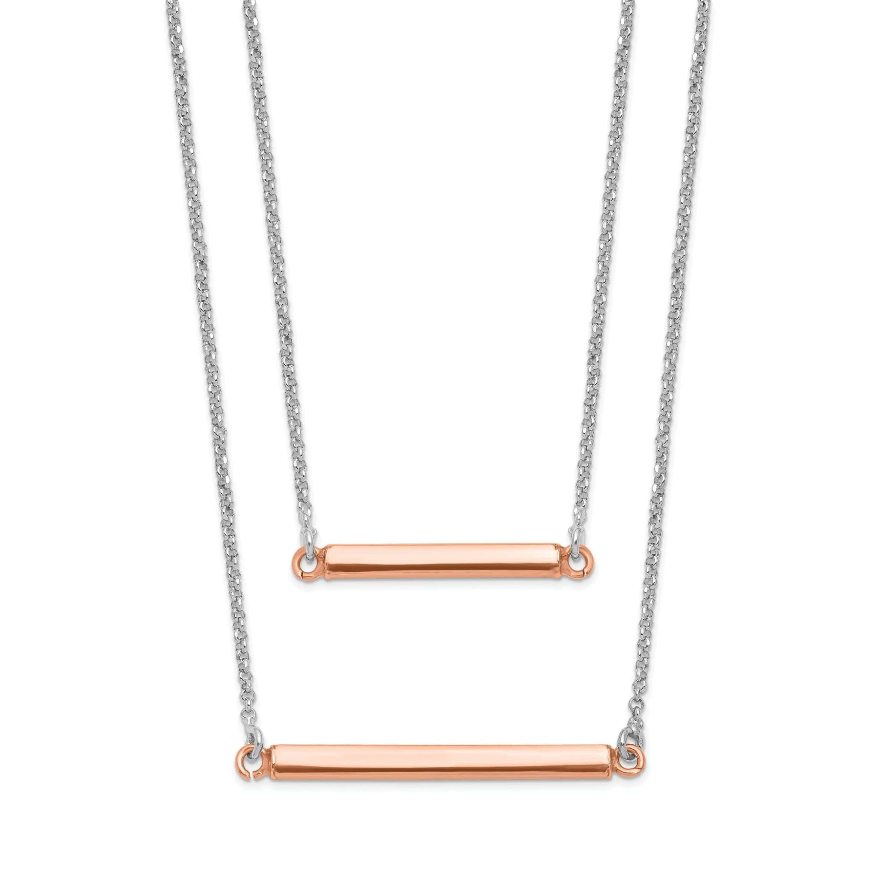 Elevate your everyday look with this captivating Sterling Silver Fancy Double Bar Necklace from Leslie's. Crafted with high-quality sterling silver and adorned with a rose gold-tone finish, this necklace exudes sophistication and elegance.