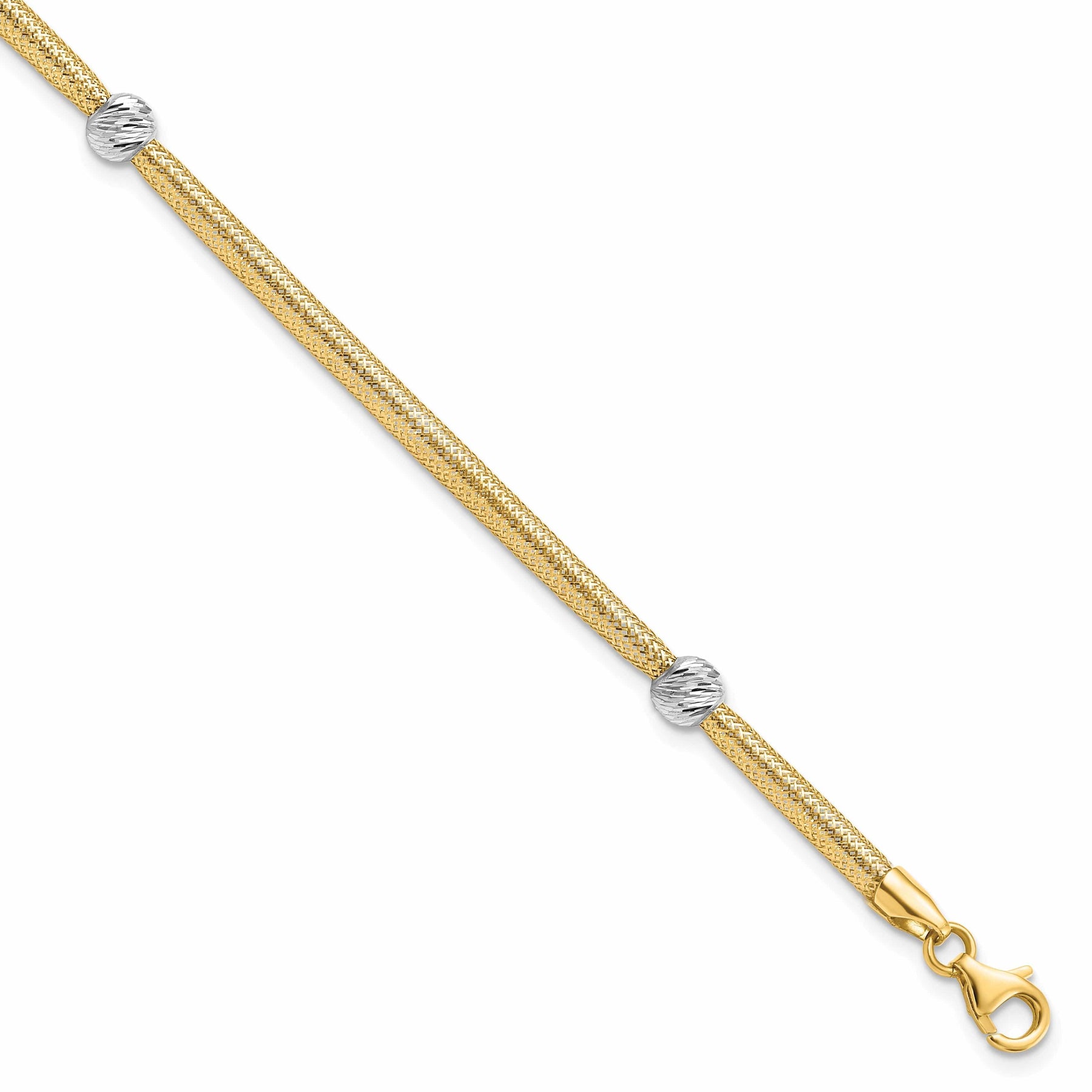 Treat yourself or someone special to Leslie's 14K Two Tone Gold Polished D.C Mesh Bracelet and add a touch of luxury to any outfit. This exquisite piece is sure to become a beloved favorite, treasured for its beauty and craftsmanship.