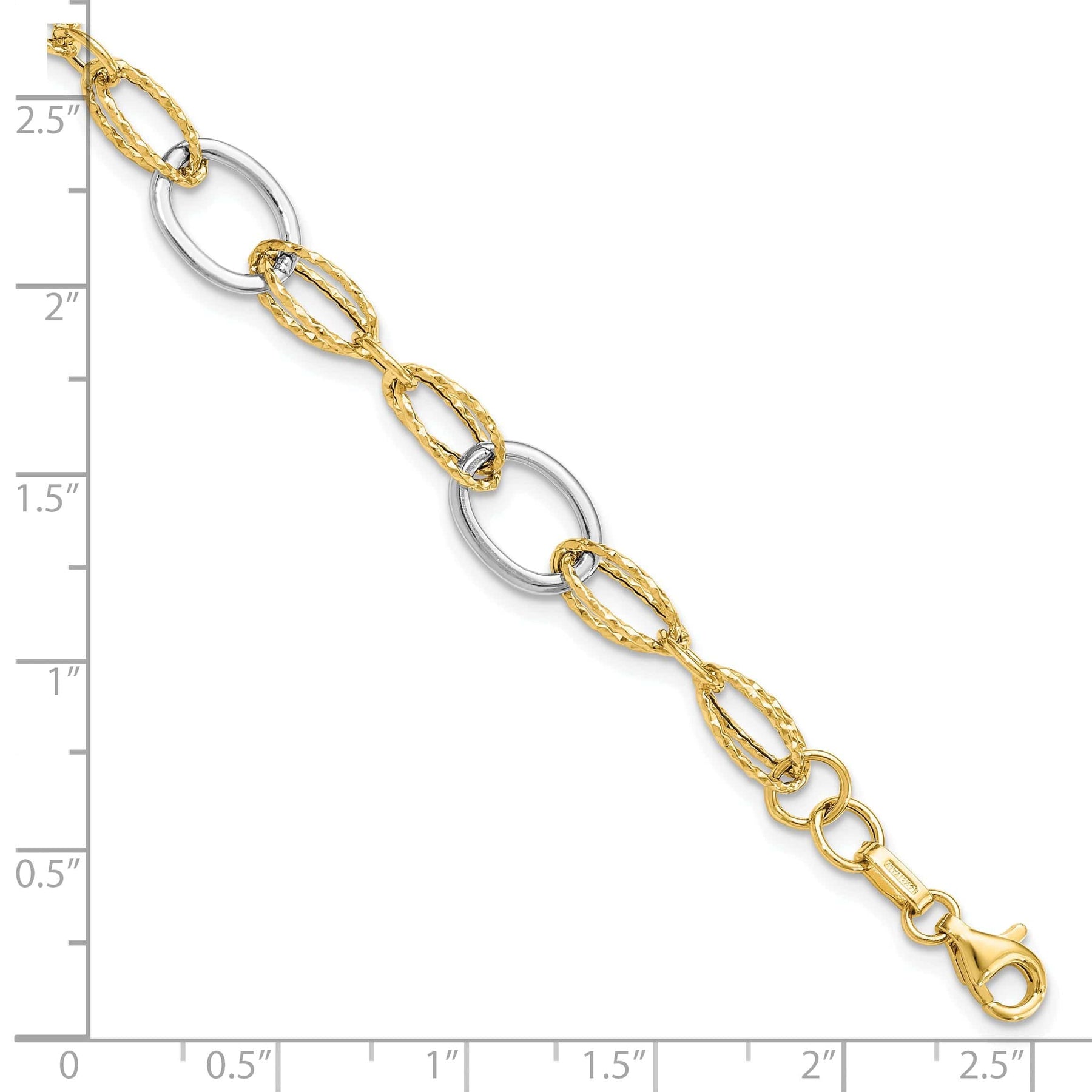 Perfect as a gift for yourself or a loved one, Leslie's 14k Two Tone Gold Polished Finish and Textured Fancy Link Bracelet is a timeless piece that will never go out of style. Add a touch of luxury and sophistication to your jewelry collection with this stunning bracelet. Order yours today and experience the beauty of fine craftsmanship and impeccable design.