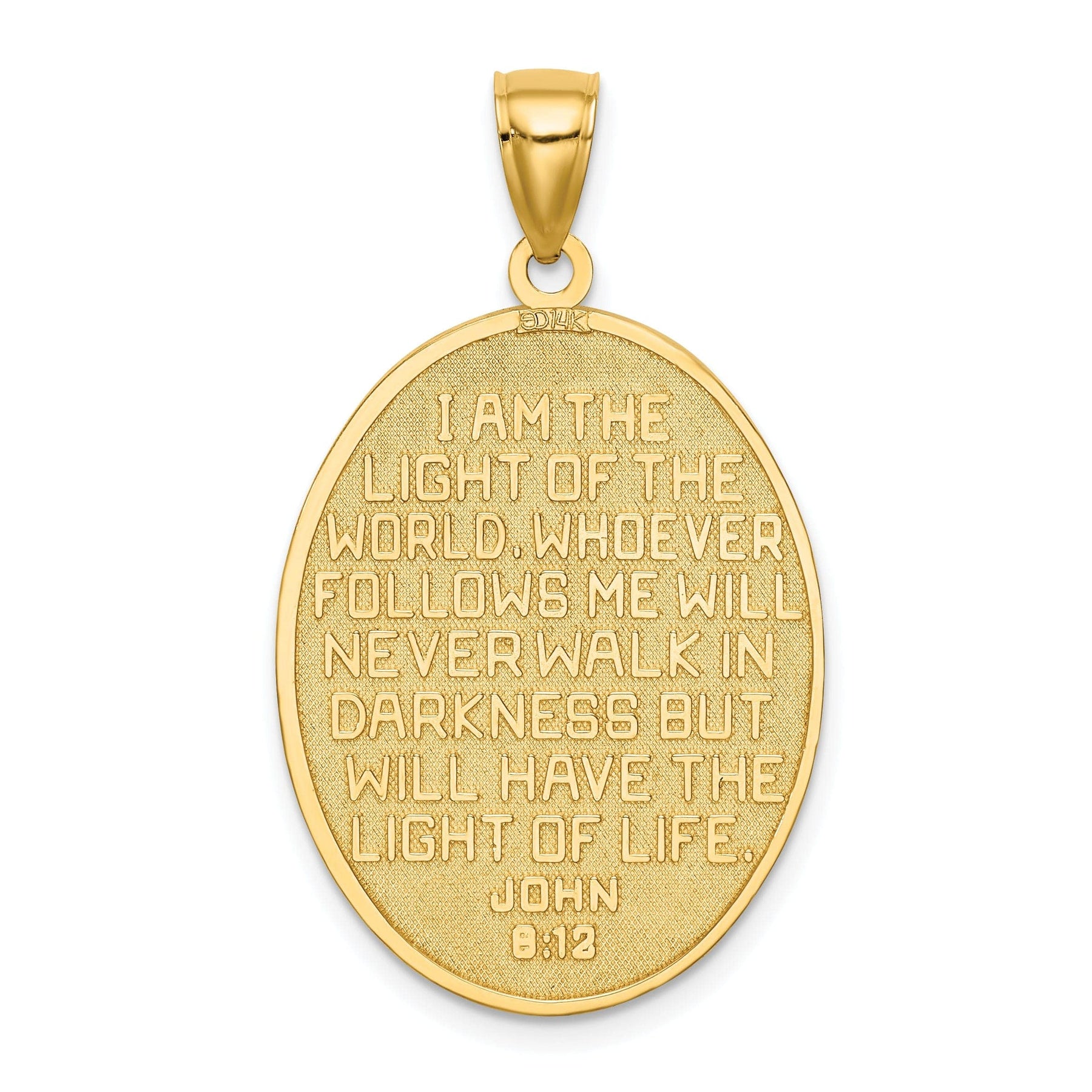 On the reverse side of the pendant, you will find the inspiring words of John 8:12, "I am the light of the world. Whoever follows me will never walk in darkness, but will have the light of life." This verse serves as a reminder of the light and hope that guides us through life's challenges.
