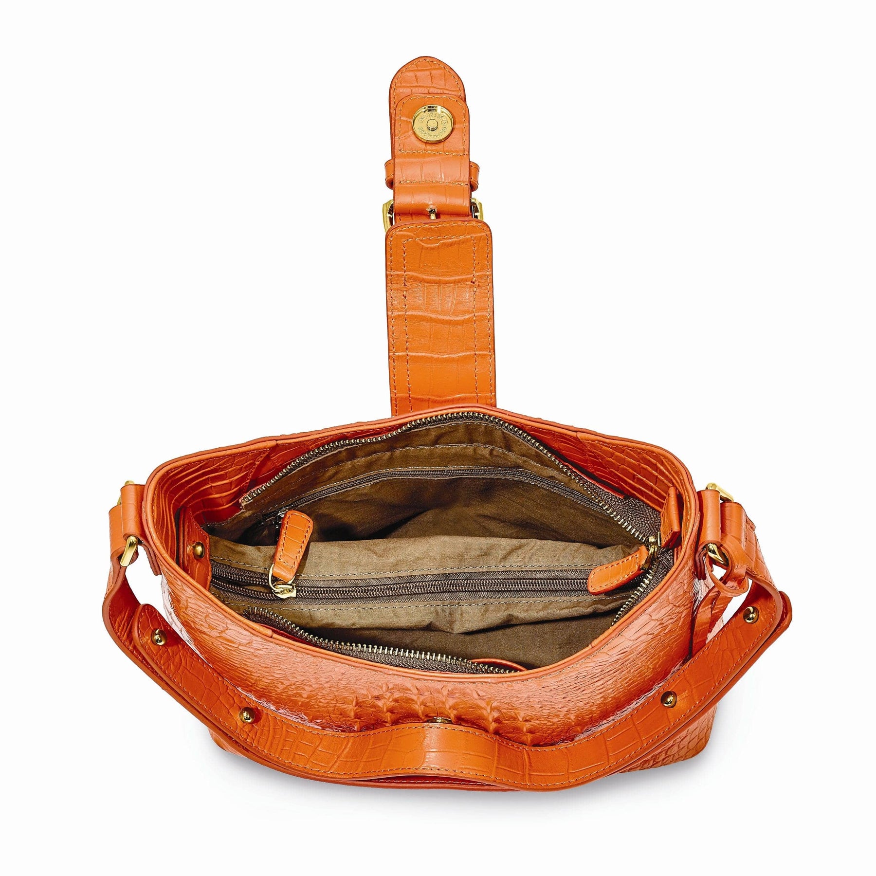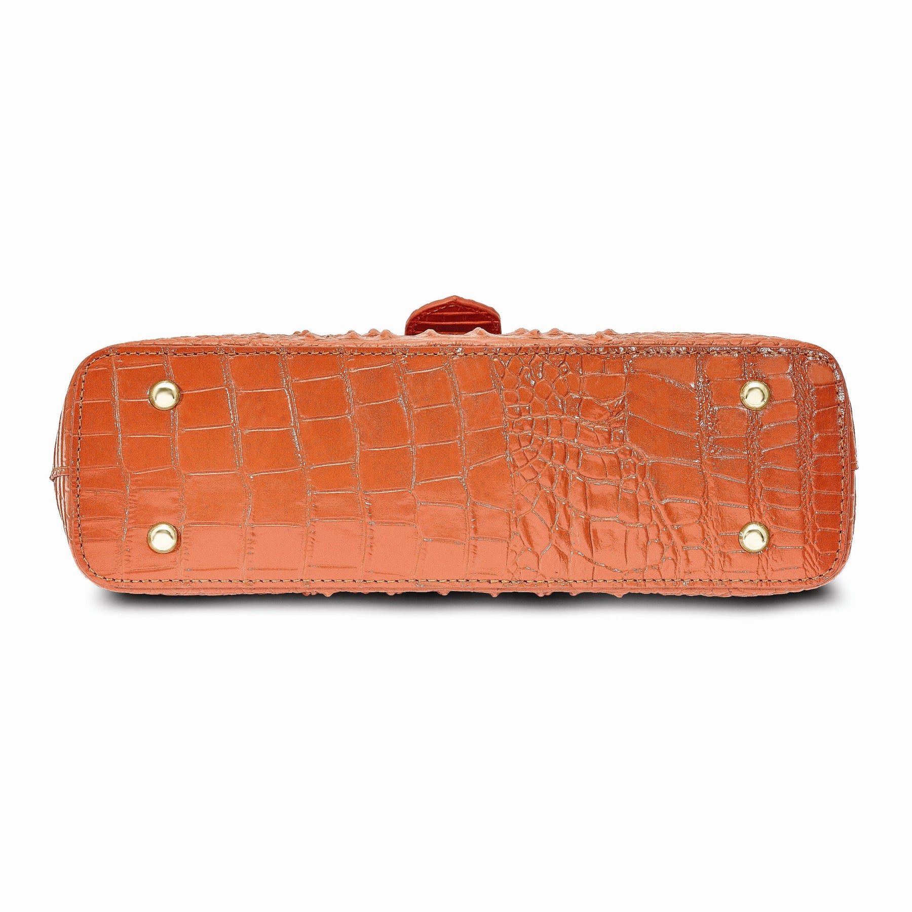 Top Grain Leather Croc Texture Cotton Lining with Removable Center and Side Zip Compartment Two Slip and Pen Pockets Key Fob Metal Feet Marigold Zip top with Magentic Buckle Strap Handbag