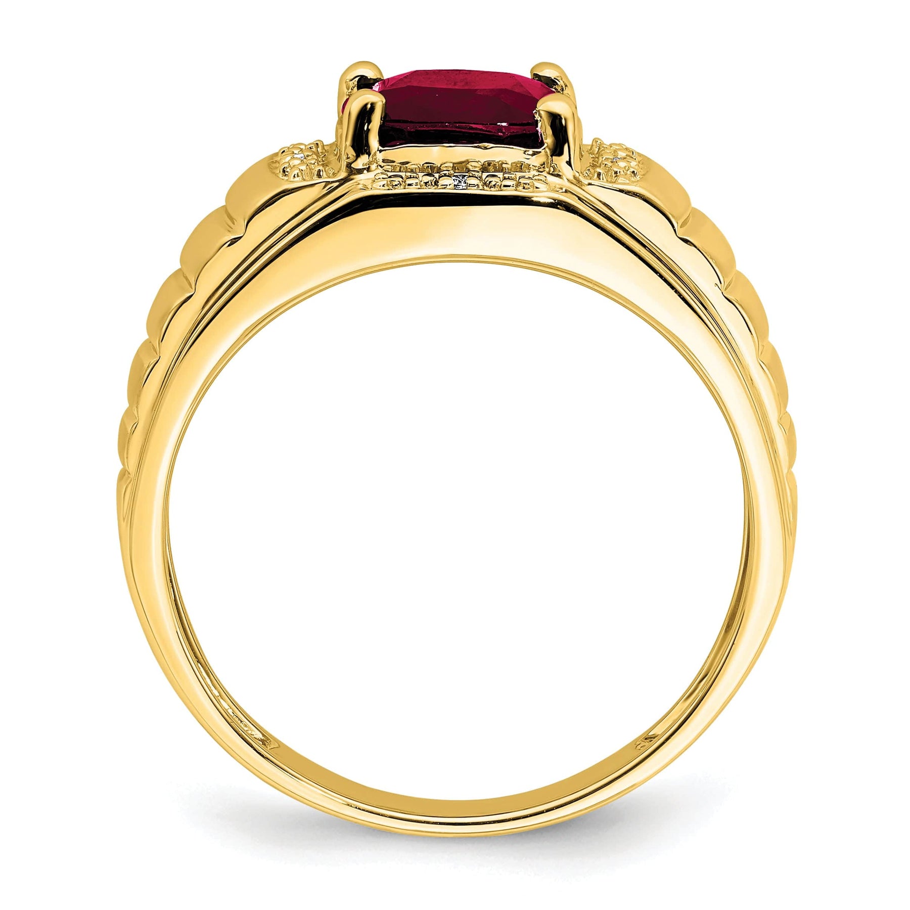 This men's ring features one stunning created ruby and a touch of diamonds for added sparkle and elegance. The 14k purity ensures that this ring is of the highest quality and will last for years to come. Perfect for special occasions or everyday wear, this 14k Yellow Gold Cushion Created Ruby and Diamond Men's Ring is sure to turn heads and make a statement.