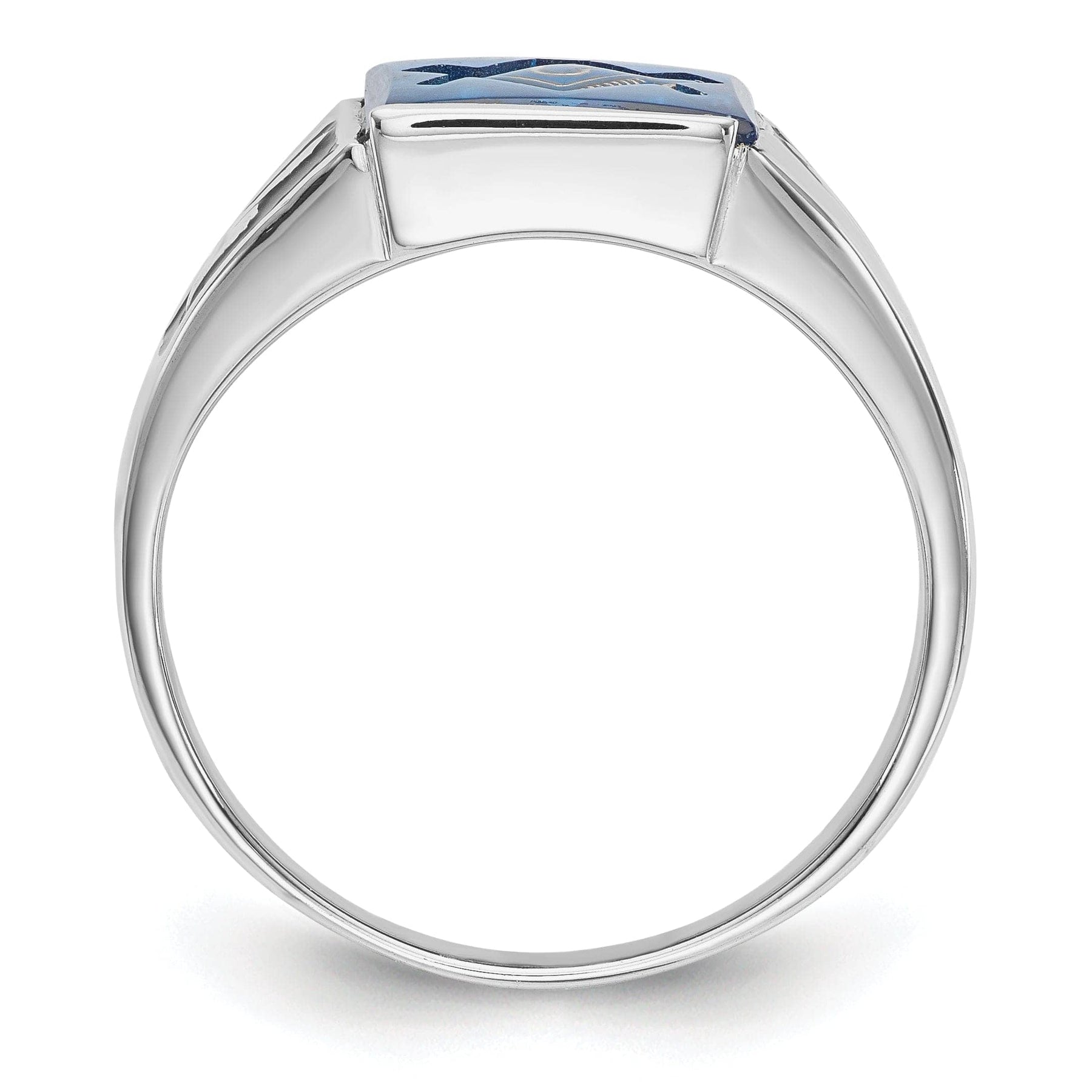 Add a touch of class to your ensemble with this 14k White Gold Men's Blue Masonic Ring. Perfect for everyday wear or special occasions, this ring is a testament to your impeccable taste and style. Upgrade your jewelry collection with this exquisite piece today.