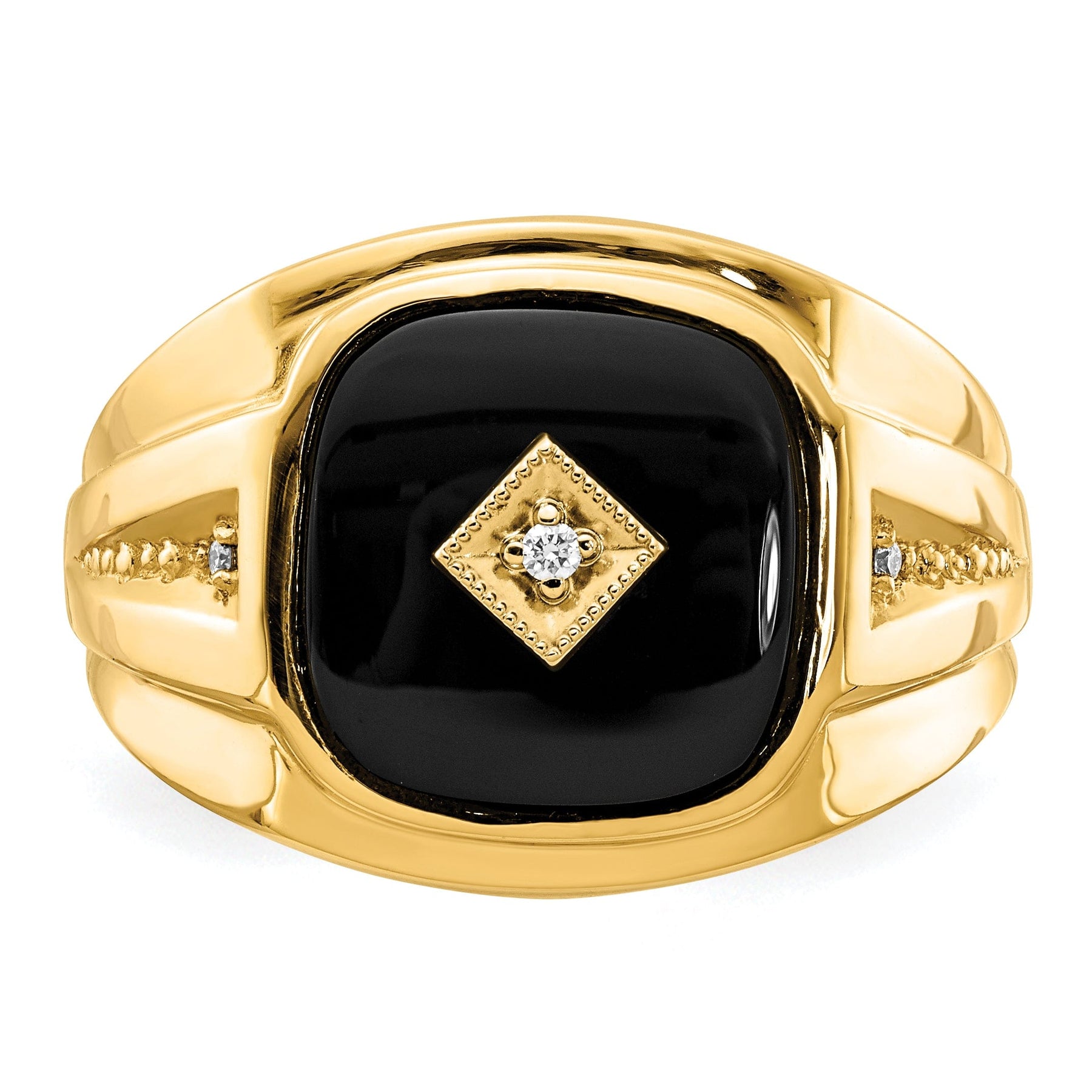Elevate your style with this stunning 14k Yellow Rhodium Men's Onyx Diamond Ring. Crafted from high-quality 14k yellow gold and accentuated with rhodium, this exquisite ring exudes sophistication and luxury. The polished onyx stone adds a touch of elegance, while the I1 clarity G-I color diamond sparkles beautifully with a .03 carat weight.