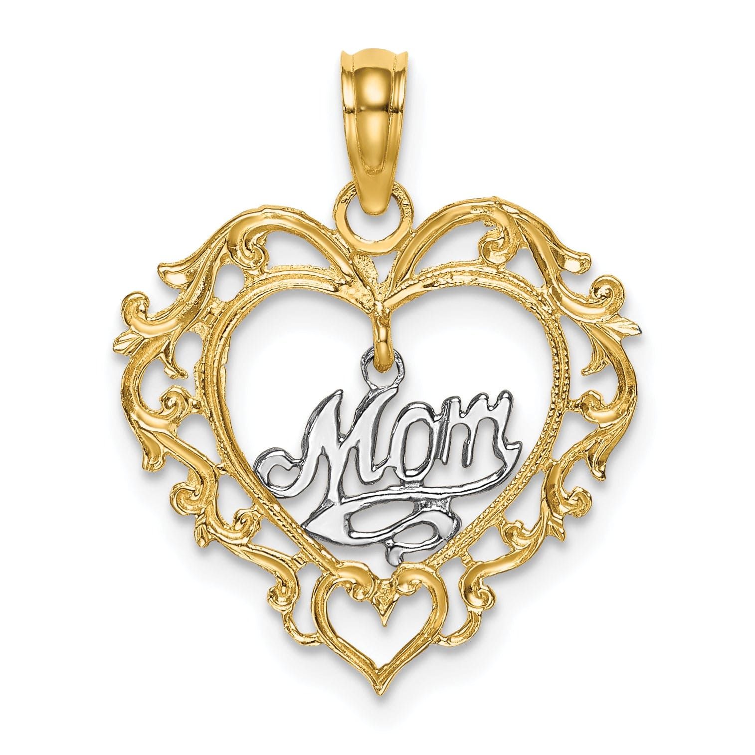 Whether you are looking for a thoughtful Mother's Day gift or a special token of love, this 14k Two-tone MOM Inside Heart Charm Pendant is sure to make a statement. Give your mom a gift she will cherish forever with this beautiful pendant that symbolizes the unconditional love between a mother and child.