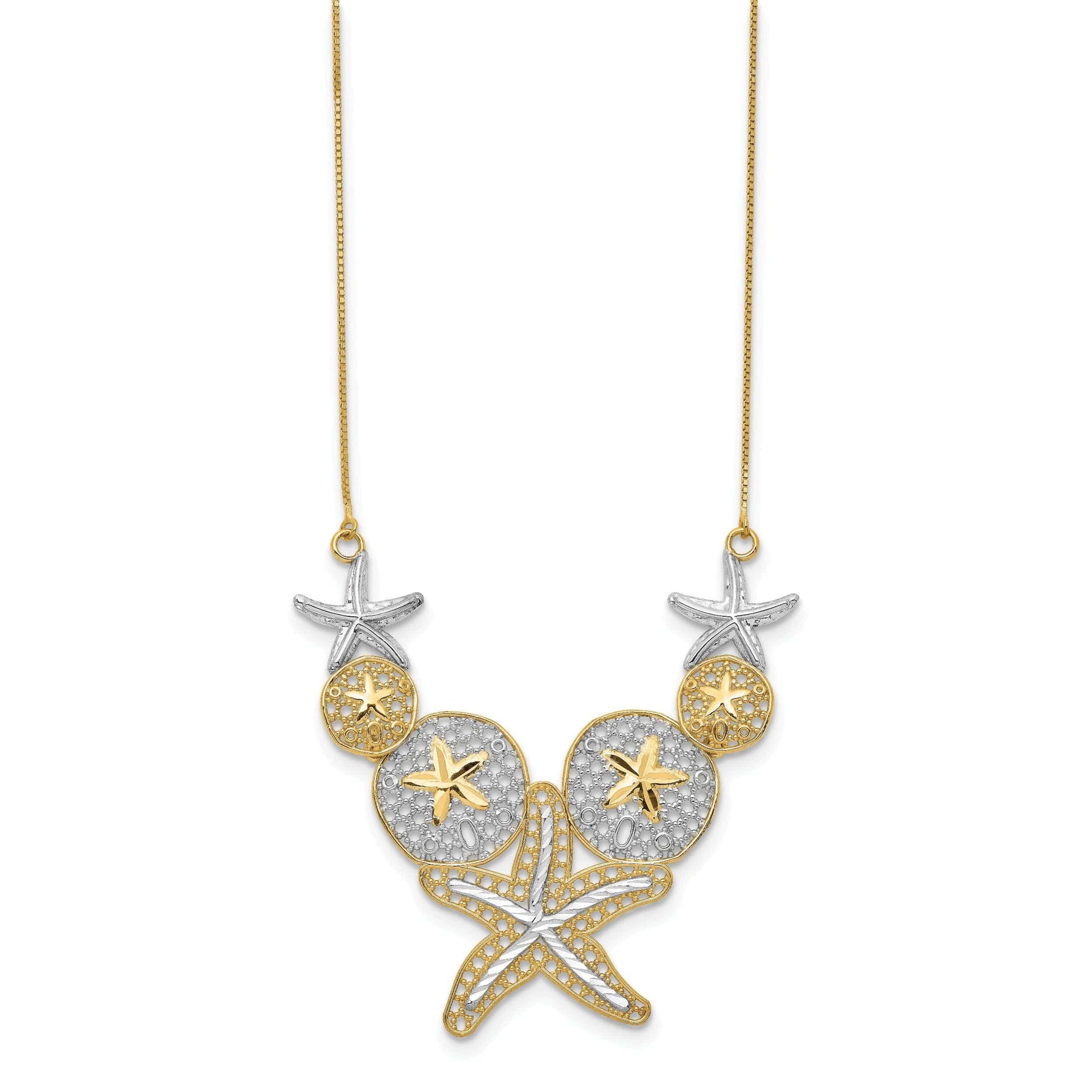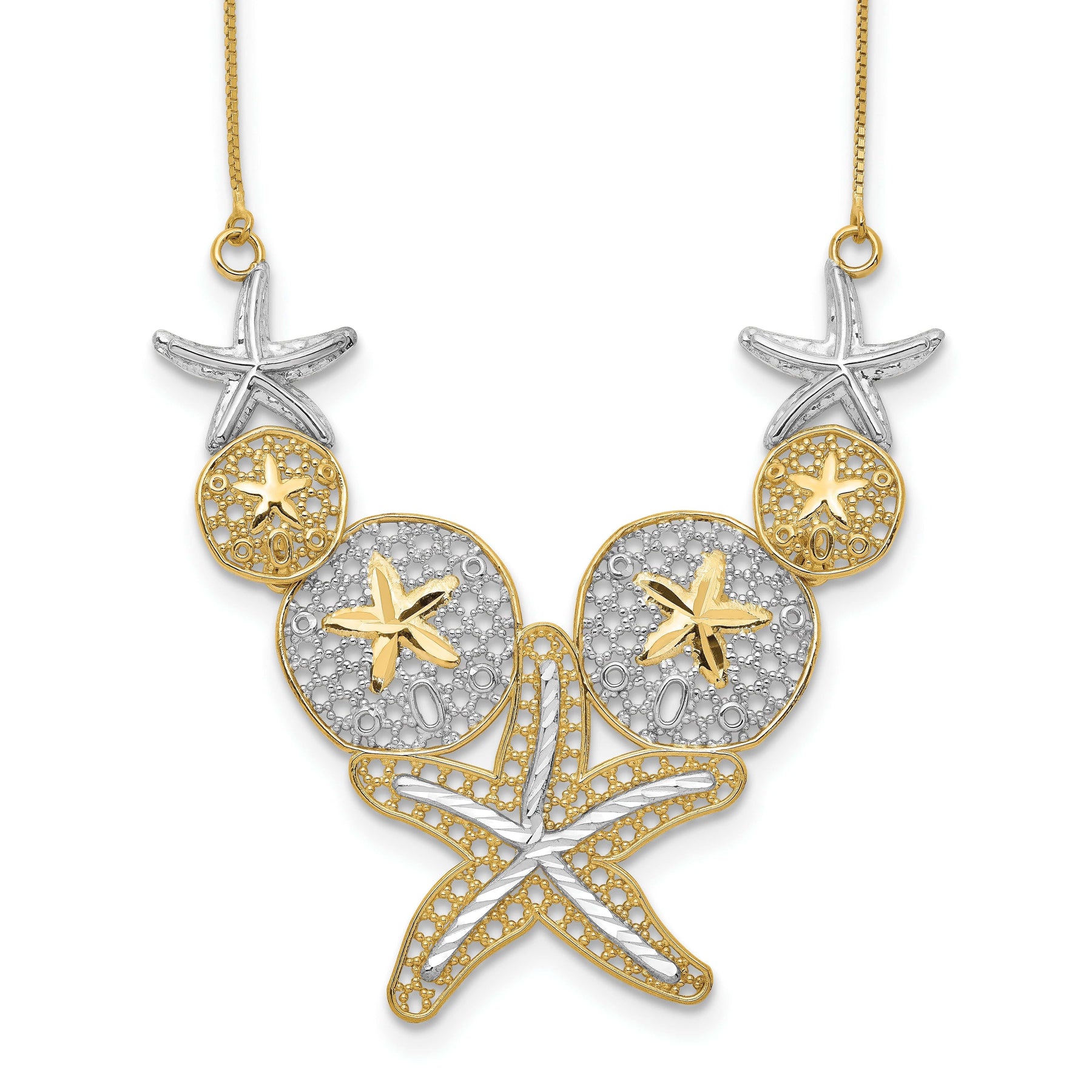 14k Yellow Gold, White Rhodium Solid Diamond Cut Finish Fancy Starfish and Sand Dollar Pendant Design in a 18-inch Box Chain Necklace Set
