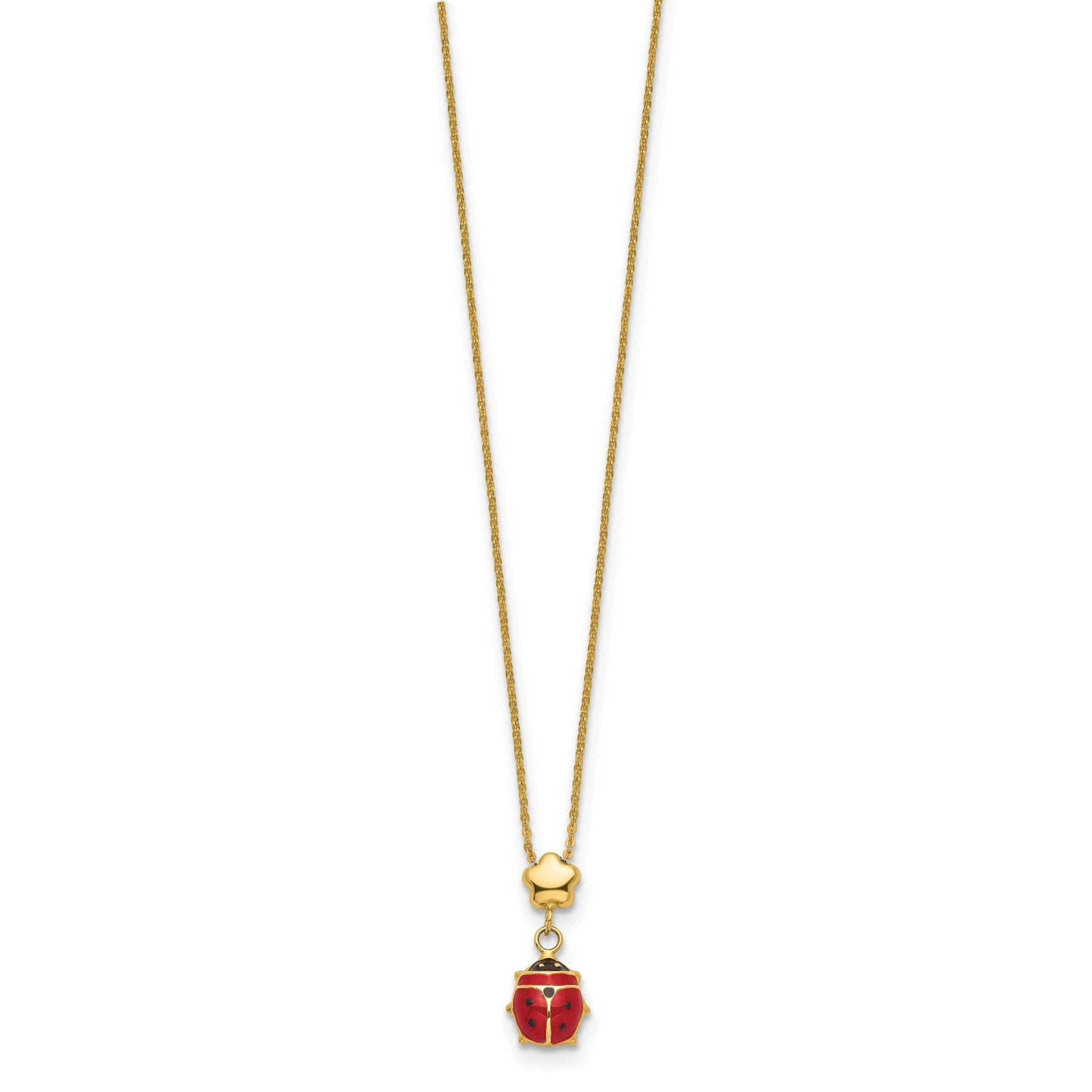 14k Yellow Gold Polished Red, Black Enameled Finish Hollow Ladybug with Flower Design Pendant in a 16.5-inch Cable Chain Necklace Set