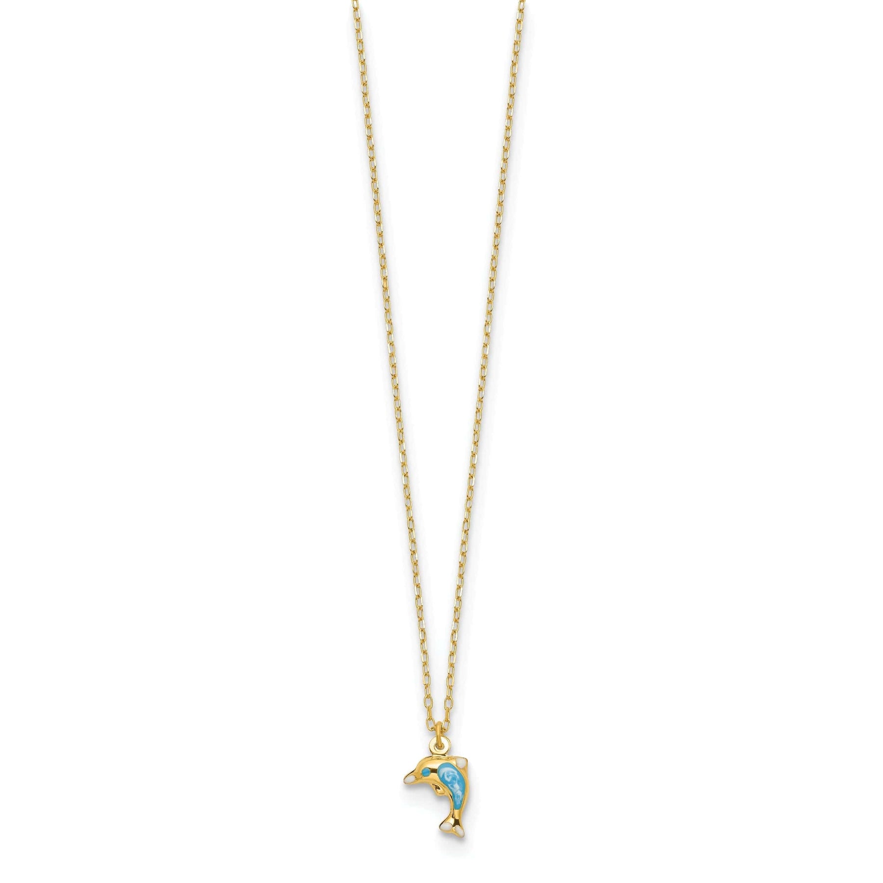 14k Yellow Gold Semi-Solid Polished White, Blue Enameled Finish 3-Dimensional Dolphin Pendant in a 16.5-inch Cable Chain Necklace Set
