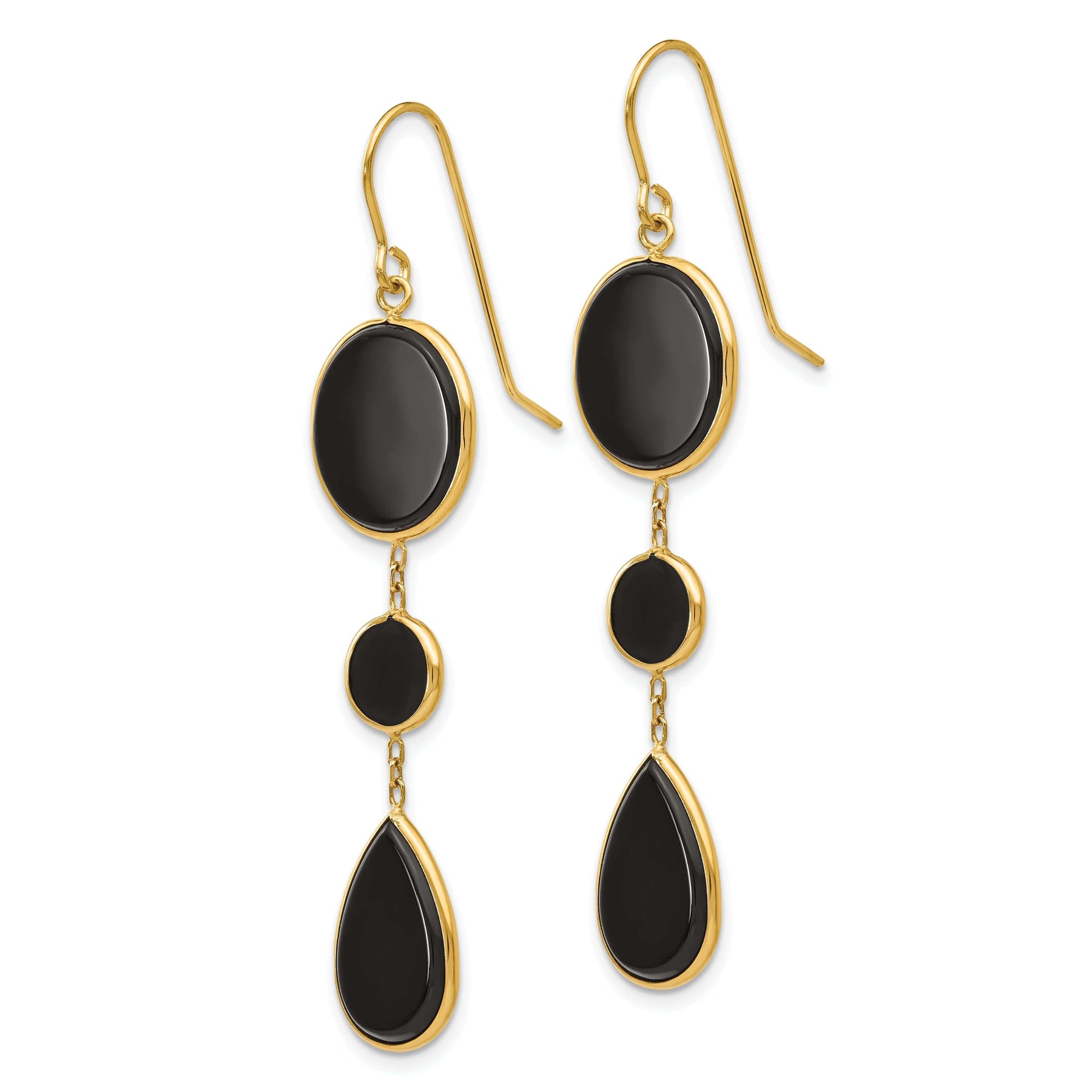 These earrings are lightweight and comfortable to wear, making them a great choice for all-day wear. The secure hook closure ensures that they stay in place, so you can wear them with confidence. Whether you're dressing up for a night out or adding a touch of luxury to your everyday look, these 14k Yellow Gold Onyx Geometric Dangle Earrings are a must-have accessory. Treat yourself or someone special to these beautiful earrings and elevate any outfit with their stunning beauty.