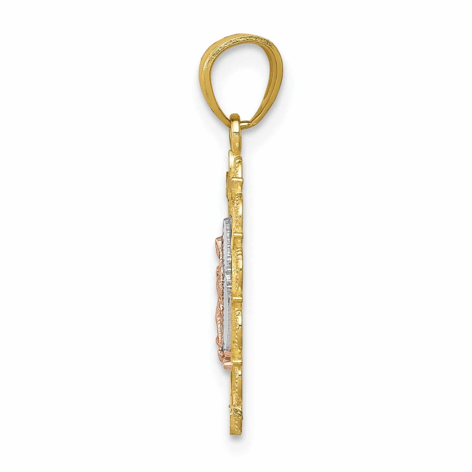 Elevate your faith and style with our exquisite 10K Two Tone Gold Our Lady Of Guadalupe Pendant. Crafted from solid 10K gold with a polished rose rhodium finish, this pendant features a stunning oval shape filigree charm that beautifully showcases the intricate details of Our Lady Of Guadalupe. The two-tone design adds a touch of elegance and sophistication to this religious piece.