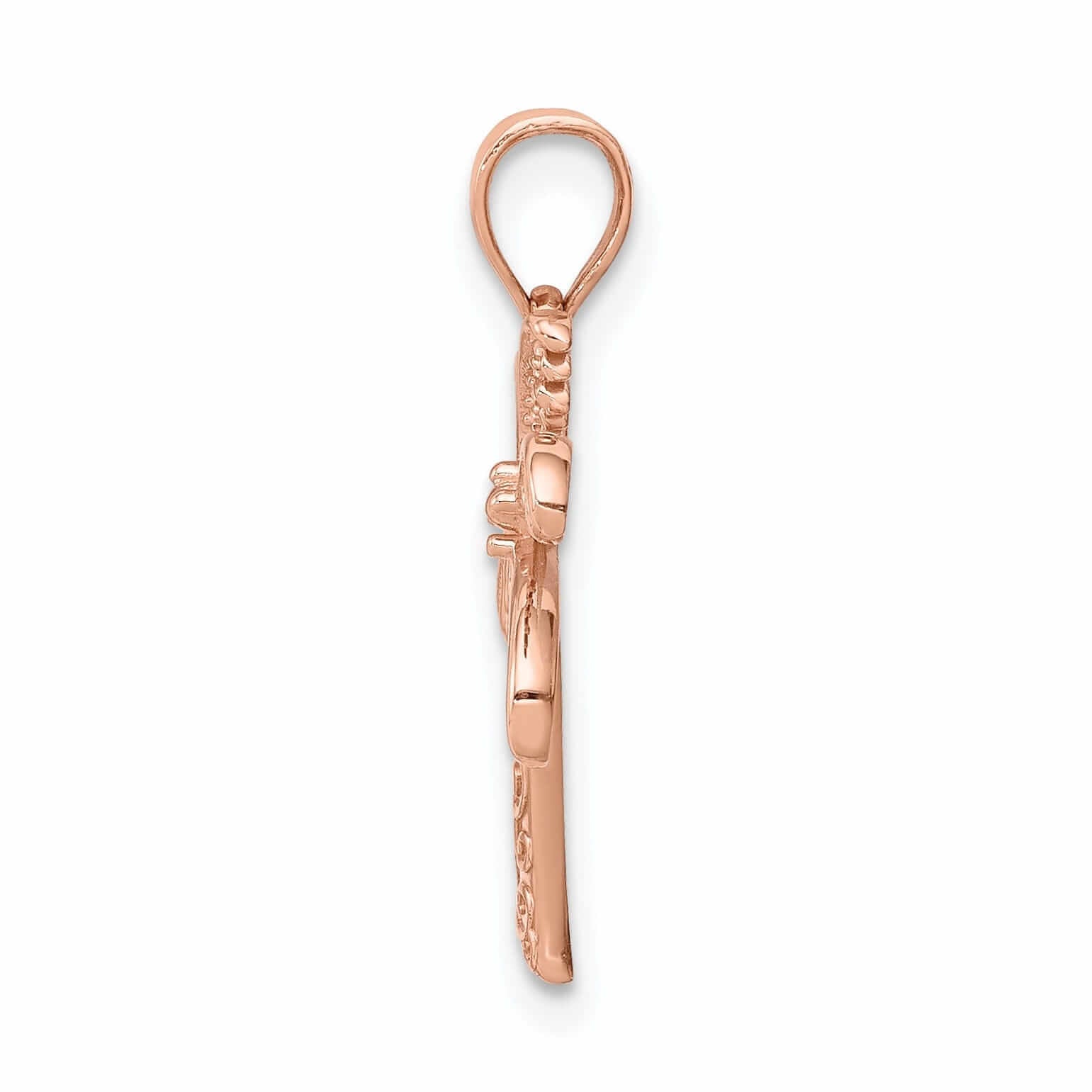 Add a touch of tropical elegance to your jewelry collection with this stunning 14K Rose Gold Solid Polished Textured Finish Open Back Double Palm Trees Charm Pendant. Crafted from high-quality 14K rose gold, this pendant features a polished and textured finish that shimmers beautifully in the light.