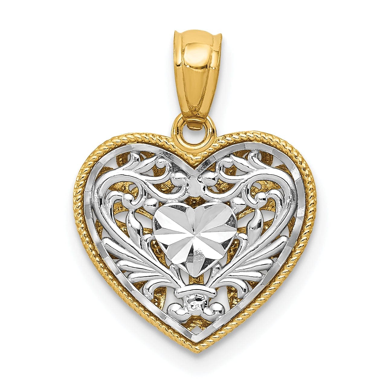 14K Two-Tone Gold Solid Polished Diamond Cut Finish Reversible Fancy Filigree Design Heart Shape Charm Pendant