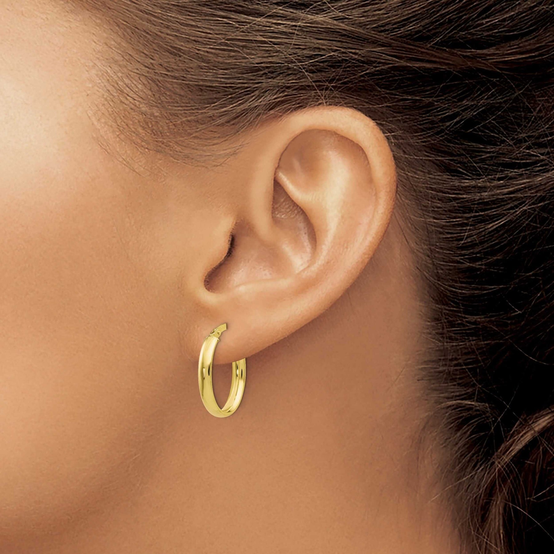 Make a bold and elegant statement with these stunning 10K yellow gold polished hoop earrings. Crafted from solid metal and meticulously polished to achieve a brilliant shine, these tube hoop earrings exude durability and style. The perfect accessory for any occasion, these hoops measure 17 mm in length and 27 mm in width, making them the ideal size for everyday wear.