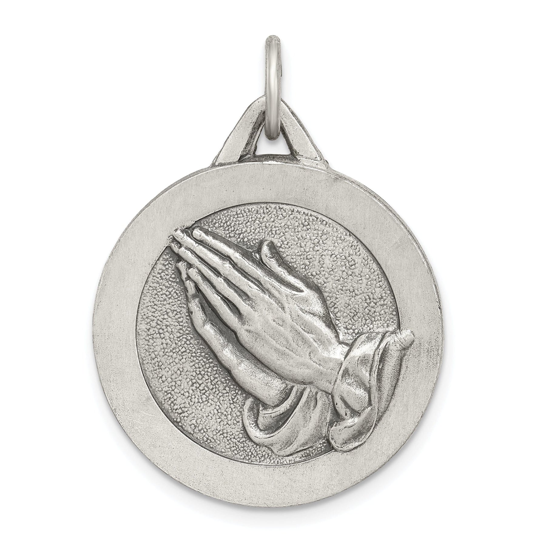 Enhance your faith and style with our stunning Sterling Silver Antiqued Praying Hands Pendant. This beautifully crafted pendant features intricate detailing of hands clasped together in prayer, symbolizing hope, love, and devotion.