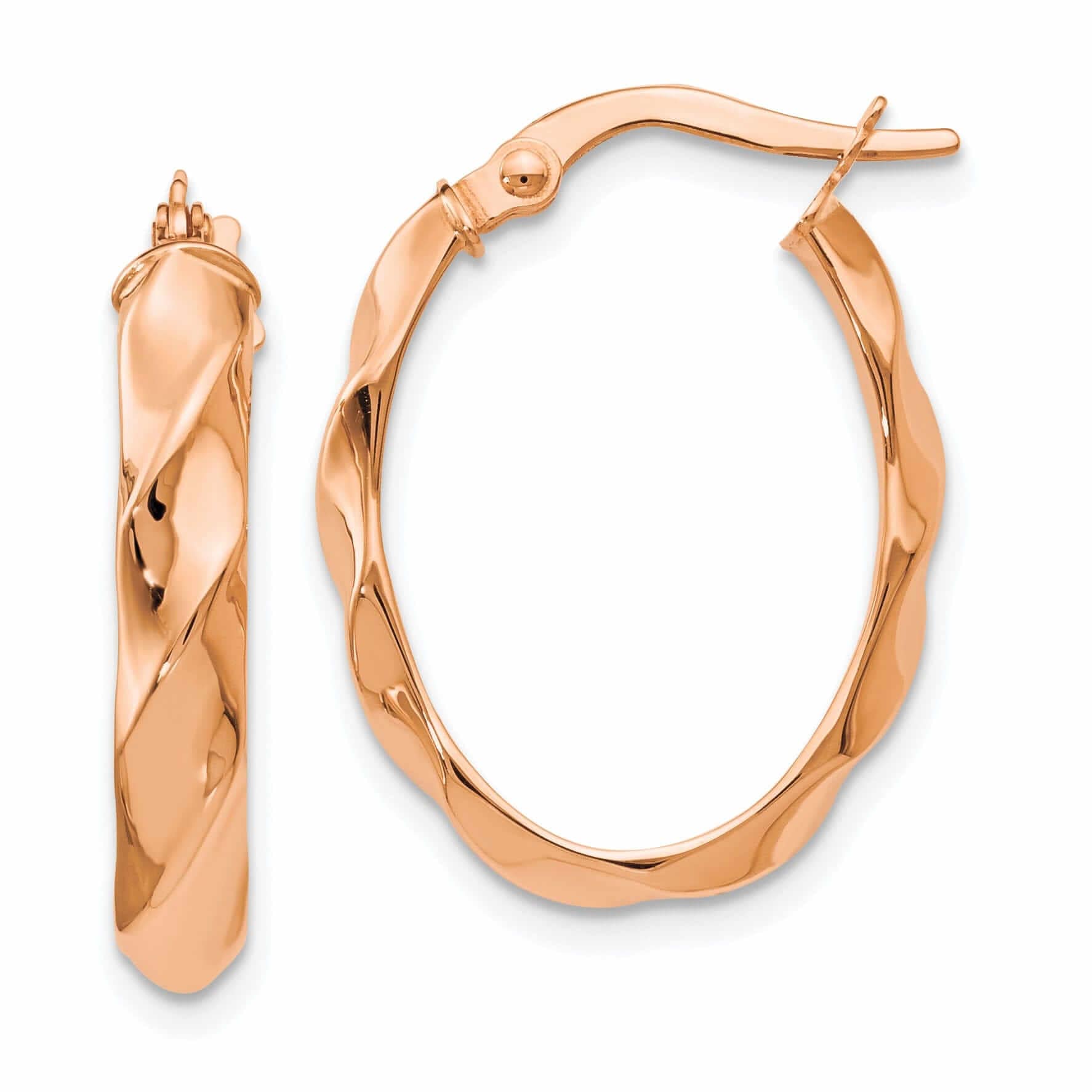 Elevate your everyday look with these stunning 14k Rose Gold Twisted Oval Hoop Earrings from Leslie's. Crafted from high-quality 14k rose gold, these earrings are both elegant and sophisticated. The twisted oval hoop design adds a unique and modern twist to a classic jewelry piece.