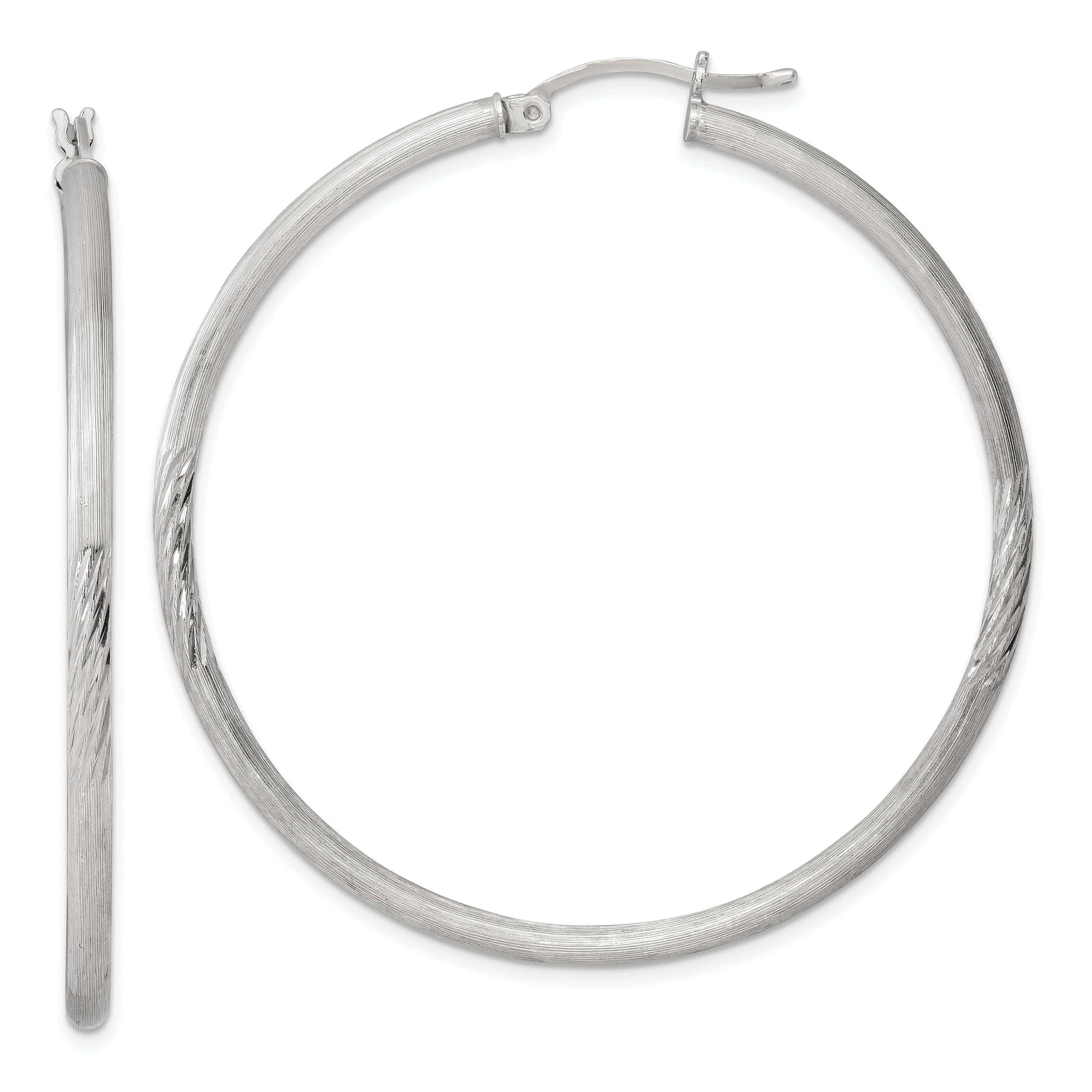 Elevate your everyday look with our stunning Silver D.C Round Hoop Hinged Earrings. Crafted from high-quality sterling silver, these earrings feature a polished satin rhodium plated finish that adds a touch of luxury to any outfit. The hollow diamond cut round hoop design is both chic and versatile, making them perfect for any occasion.