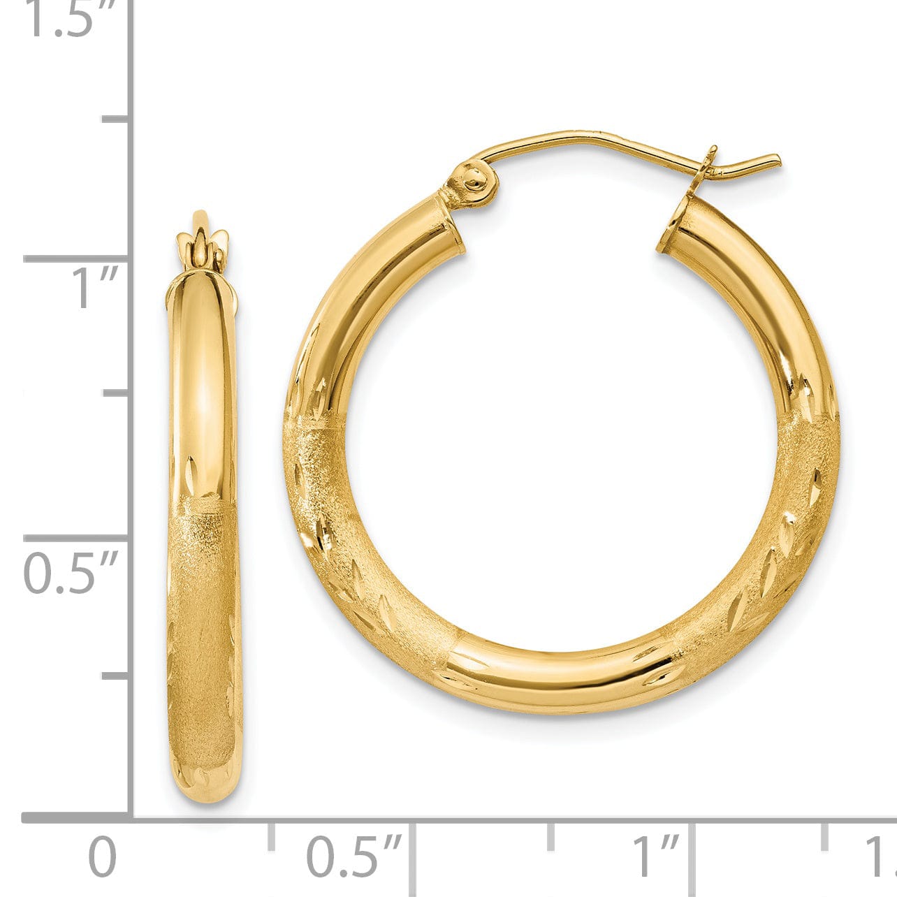 Elevate your everyday style with these stunning 14k Yellow Gold Satin Diamond Cut Round Hoop Earrings. These exquisite earrings feature a beautifully crafted design with a satin finish and intricate diamond-cut detailing, adding a touch of elegance and sophistication to any ensemble.