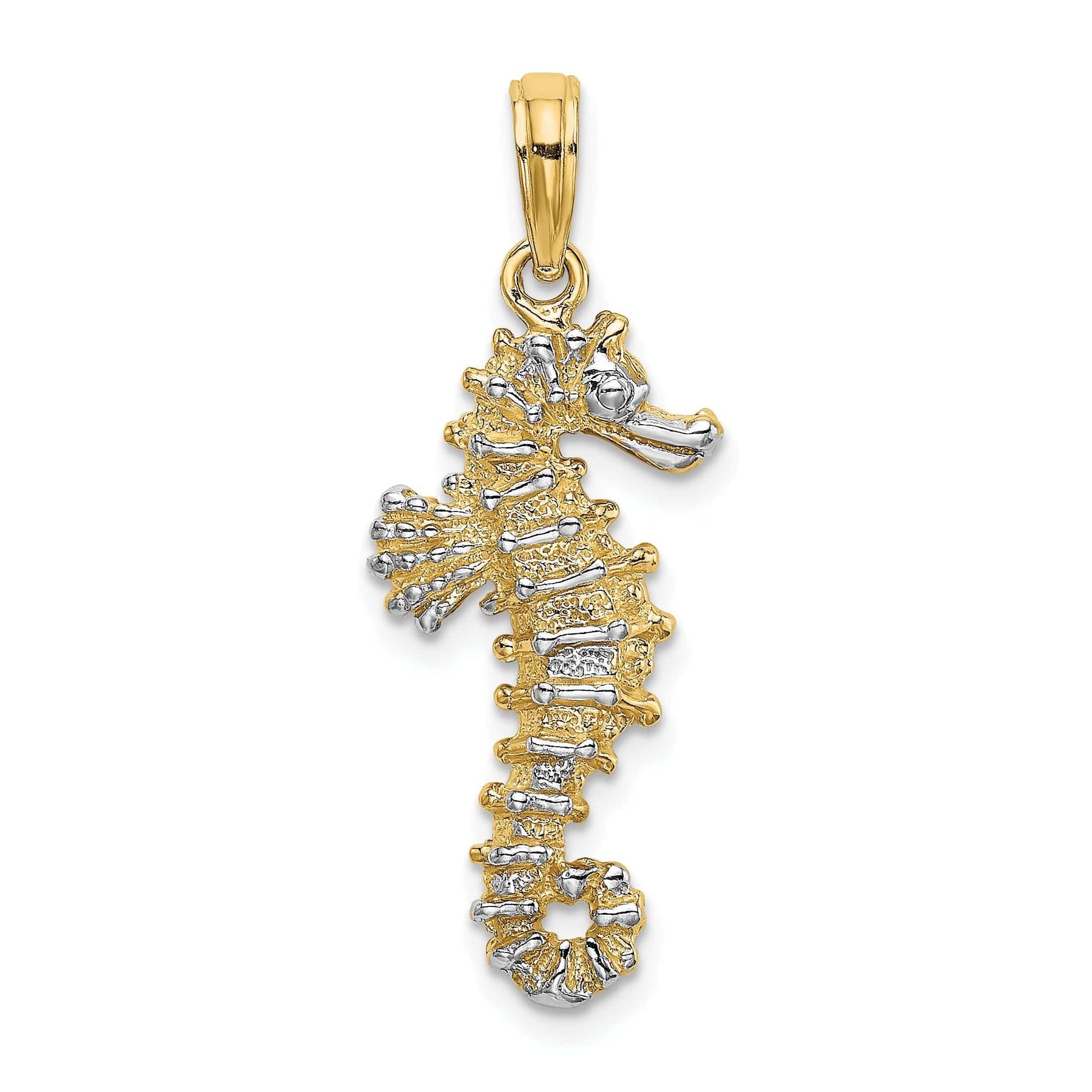 Enhance your jewelry collection with this stunning 14K Yellow Gold with White Rhodium Polished Finish Seahorse Charm Pendant. Crafted from high-quality 14K yellow gold and plated with a shiny white rhodium finish, this pendant exudes elegance and charm.