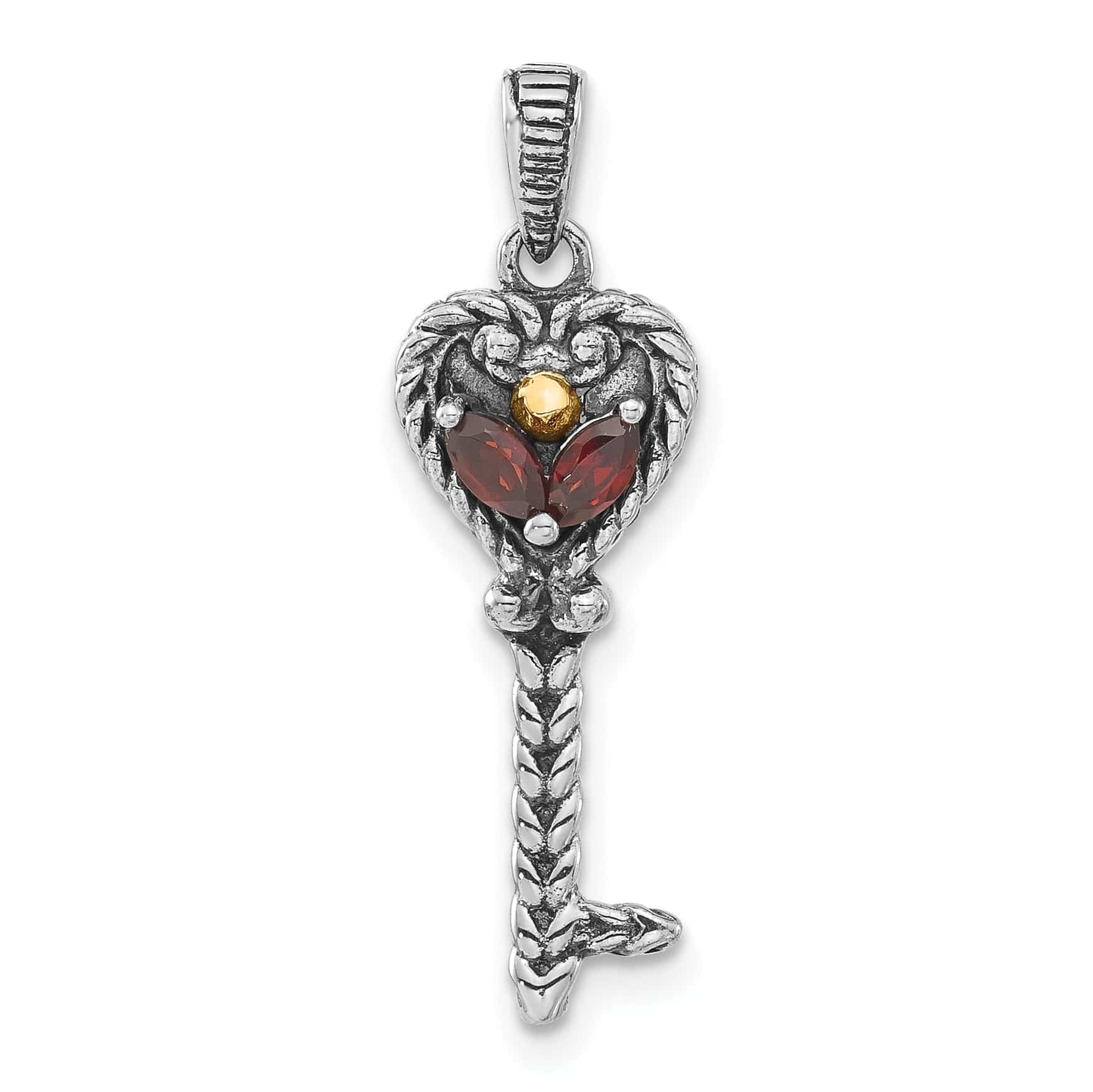 Elevate your jewelry collection with this stunning Sterling Silver and 14k Yellow Gold Garnet Key Charm. Crafted with precision and attention to detail, this charming key pendant features a brilliant .17 carat garnet gemstone that adds a pop of color and sophistication to any ensemble.