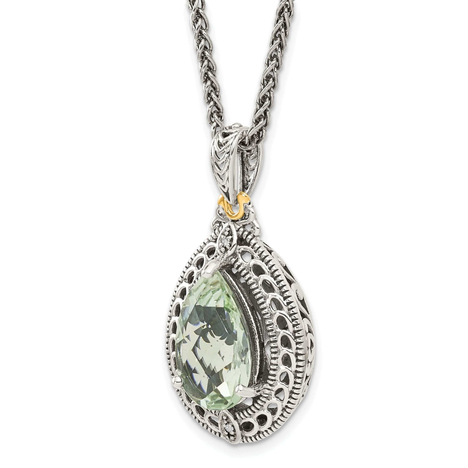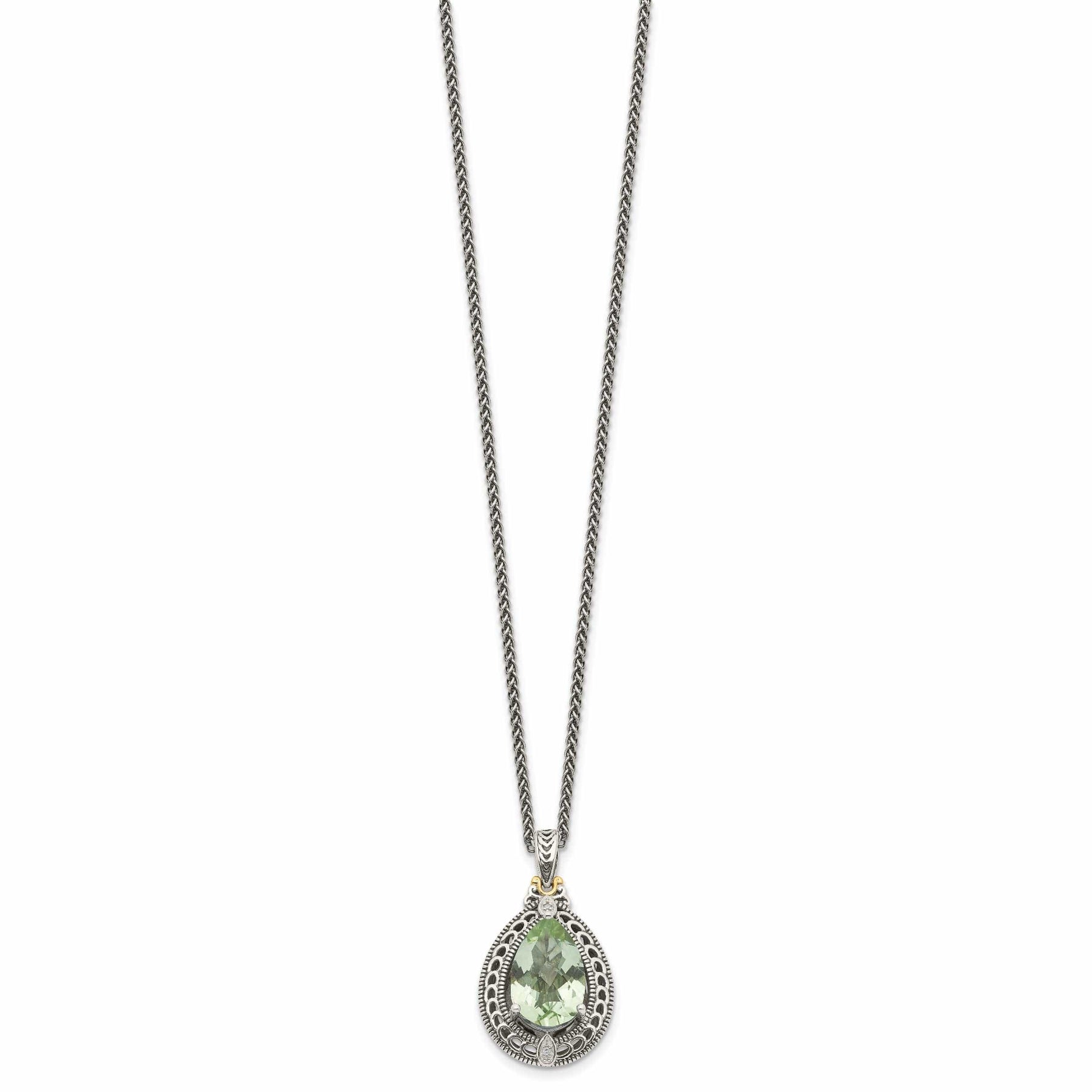 Elevate your jewelry collection with our exquisite Sterling Silver and 14k Yellow Gold Diamond Green Quartz Necklace. Crafted with the finest materials, this stunning piece features a radiant green quartz stone surrounded by dazzling diamonds set in a luxurious 14k yellow gold frame. The combination of sterling silver and gold adds a touch of elegance and sophistication to this unique necklace.