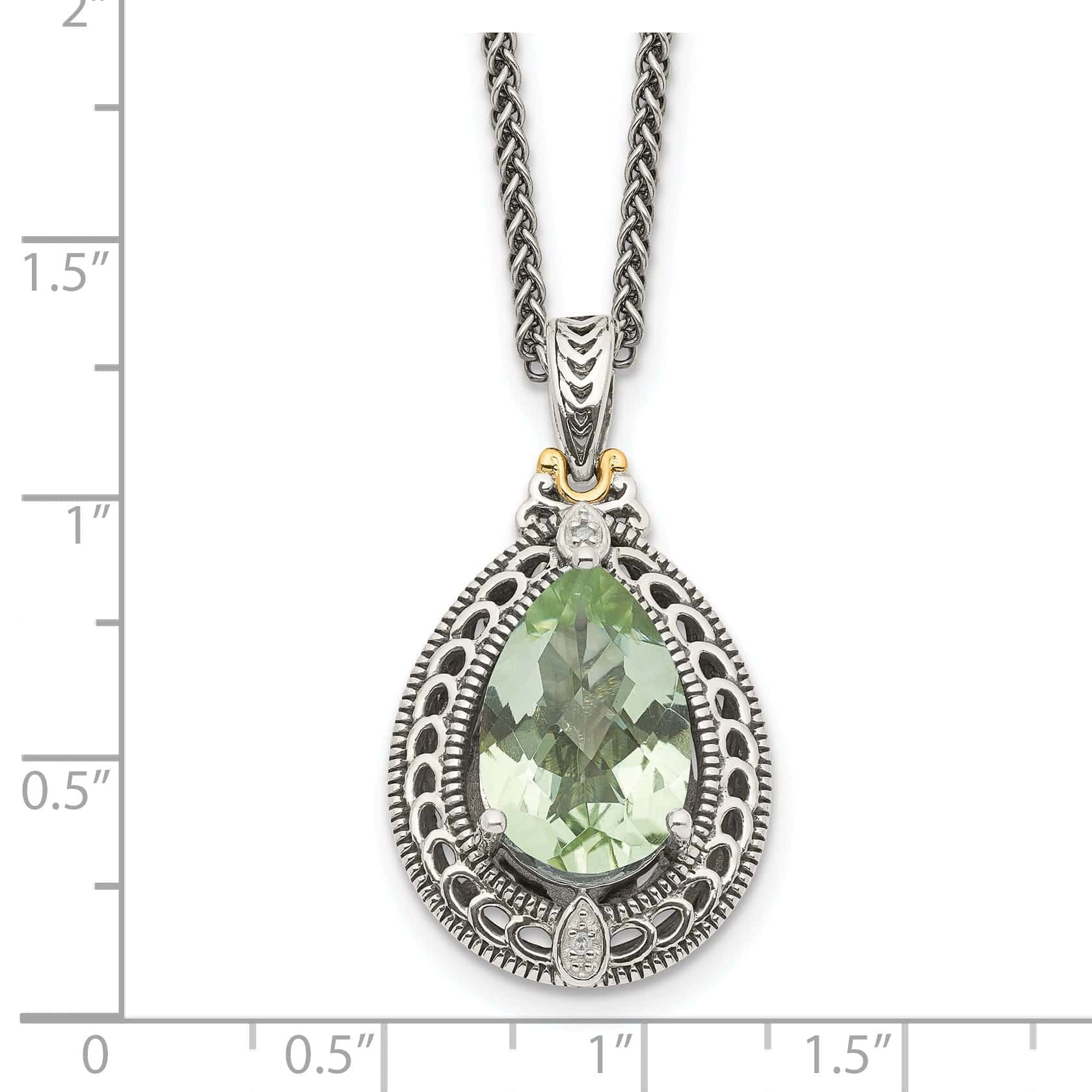 Make a bold statement and showcase your impeccable style with our Sterling Silver and 14k Yellow Gold Diamond Green Quartz Necklace. A timeless piece that will be cherished for years to come.