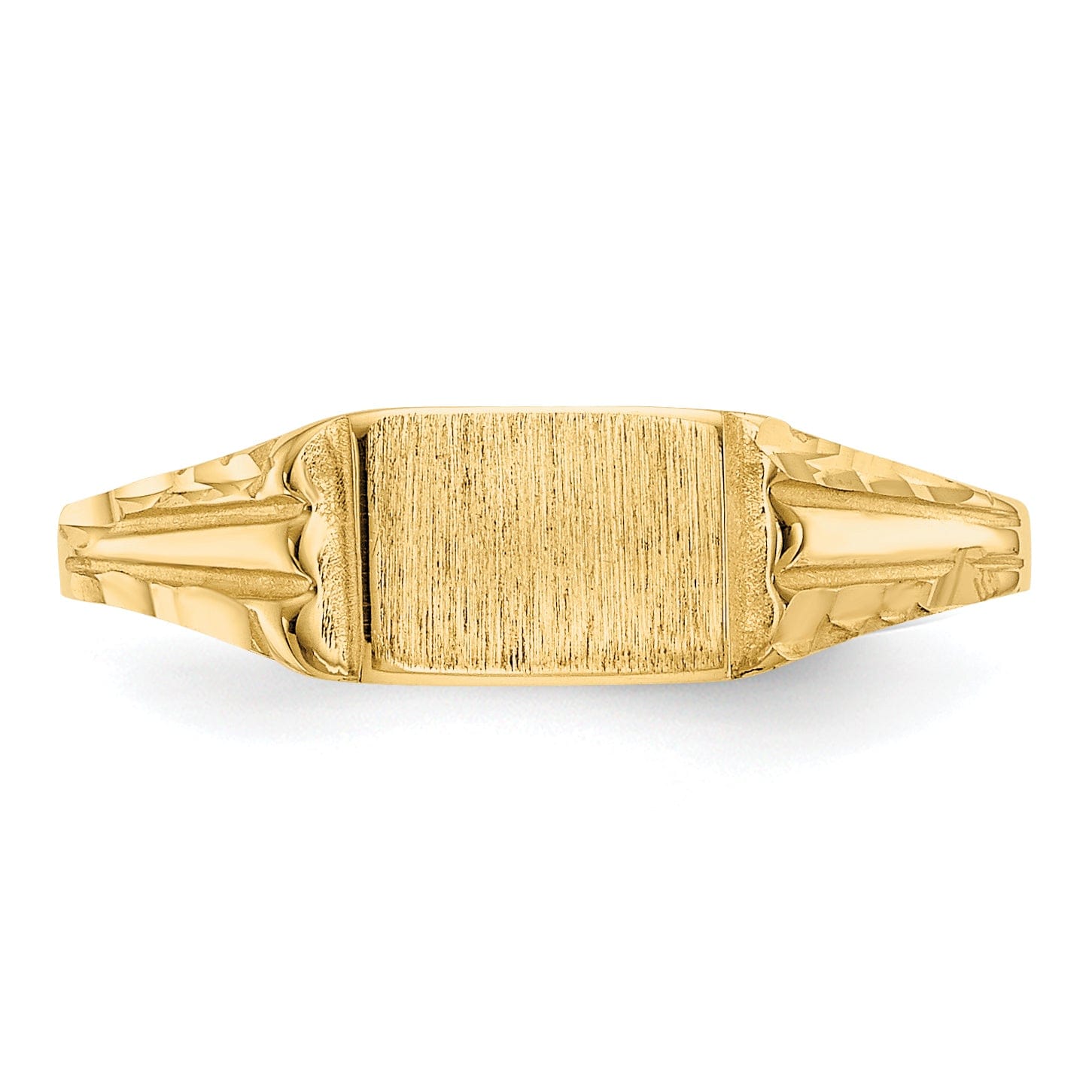 Introducing our exquisite 14k Yellow Gold Child's Diamond Cut Engraveable Signet Ring. This stunning piece of jewelry is the perfect accessory for any little one who wants to add a touch of sophistication to their everyday look. Crafted from high-quality 14k yellow gold, this signet ring is both durable and elegant.