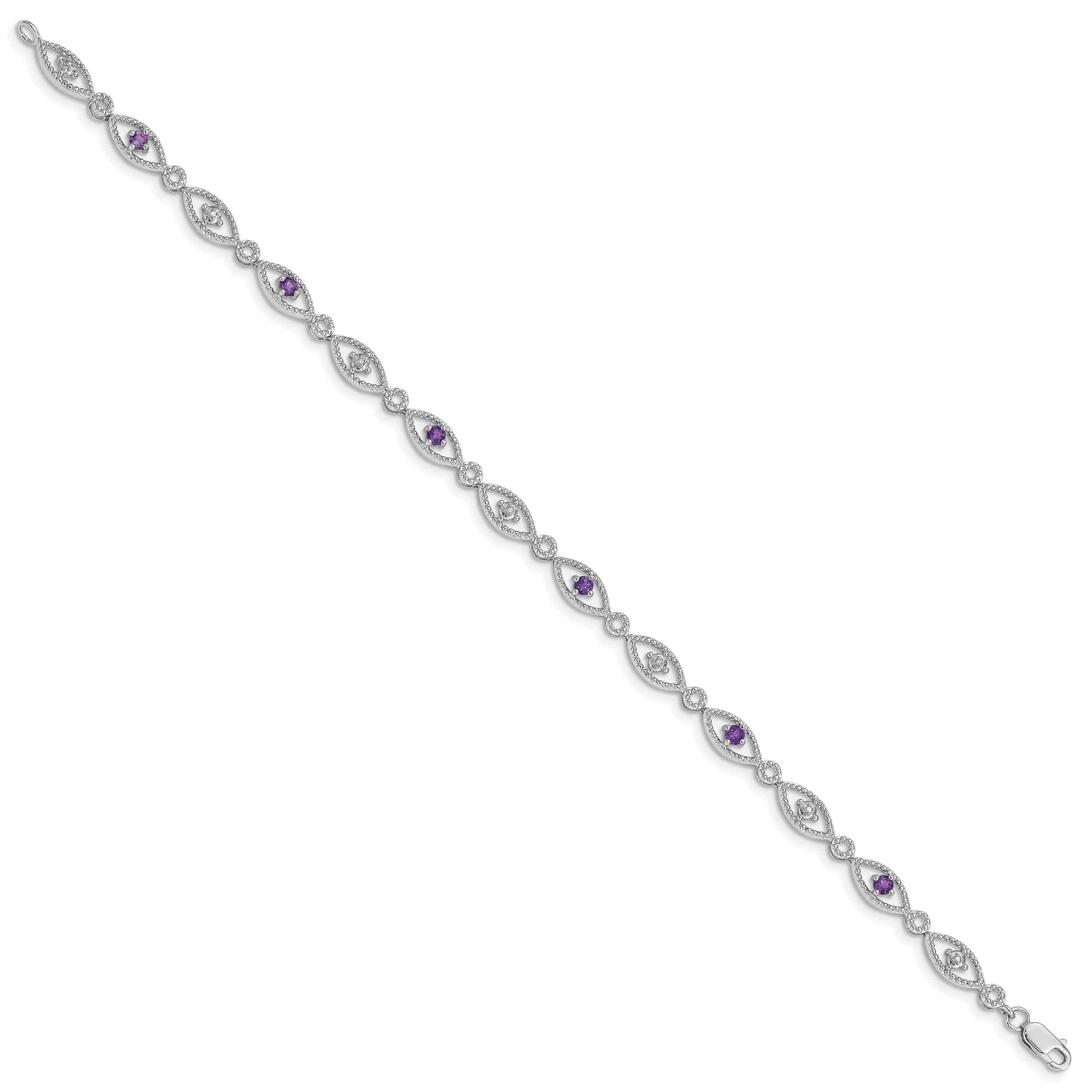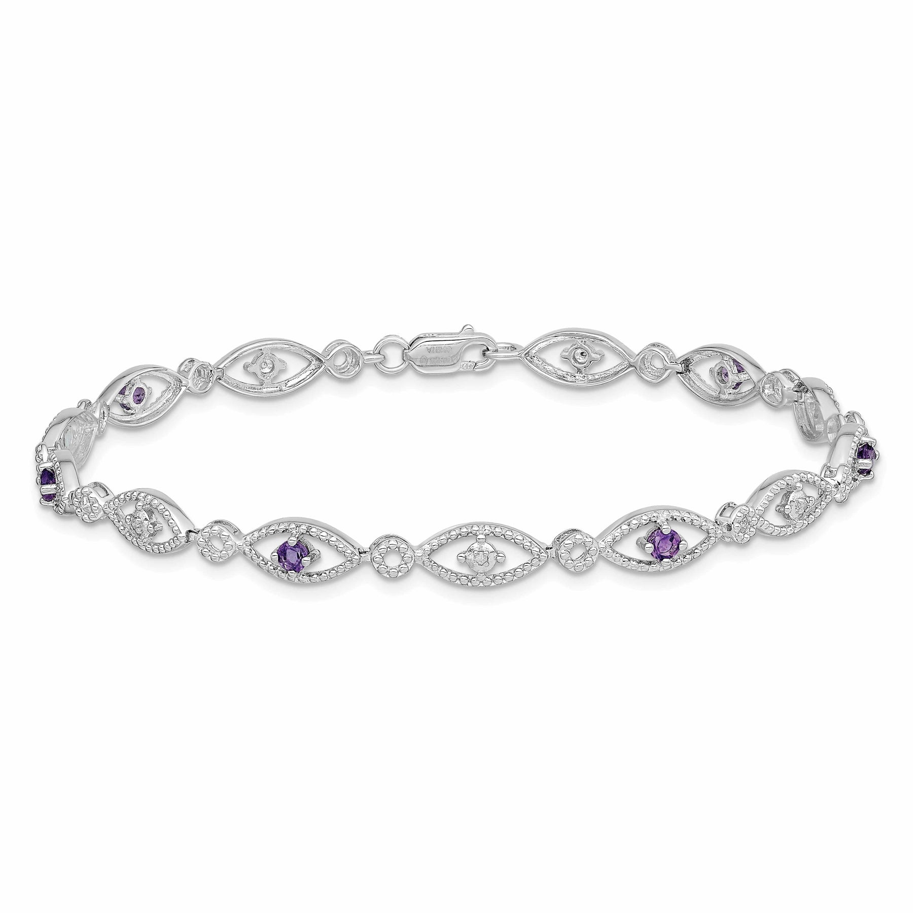 Elevate your jewelry collection with this stunning Silver Diamond Amethyst Gemstone Bracelet. Crafted from high-quality sterling silver and polished with a rhodium plating, this bracelet is designed to last a lifetime. The textured finish adds a touch of sophistication and style to this already eye-catching piece.