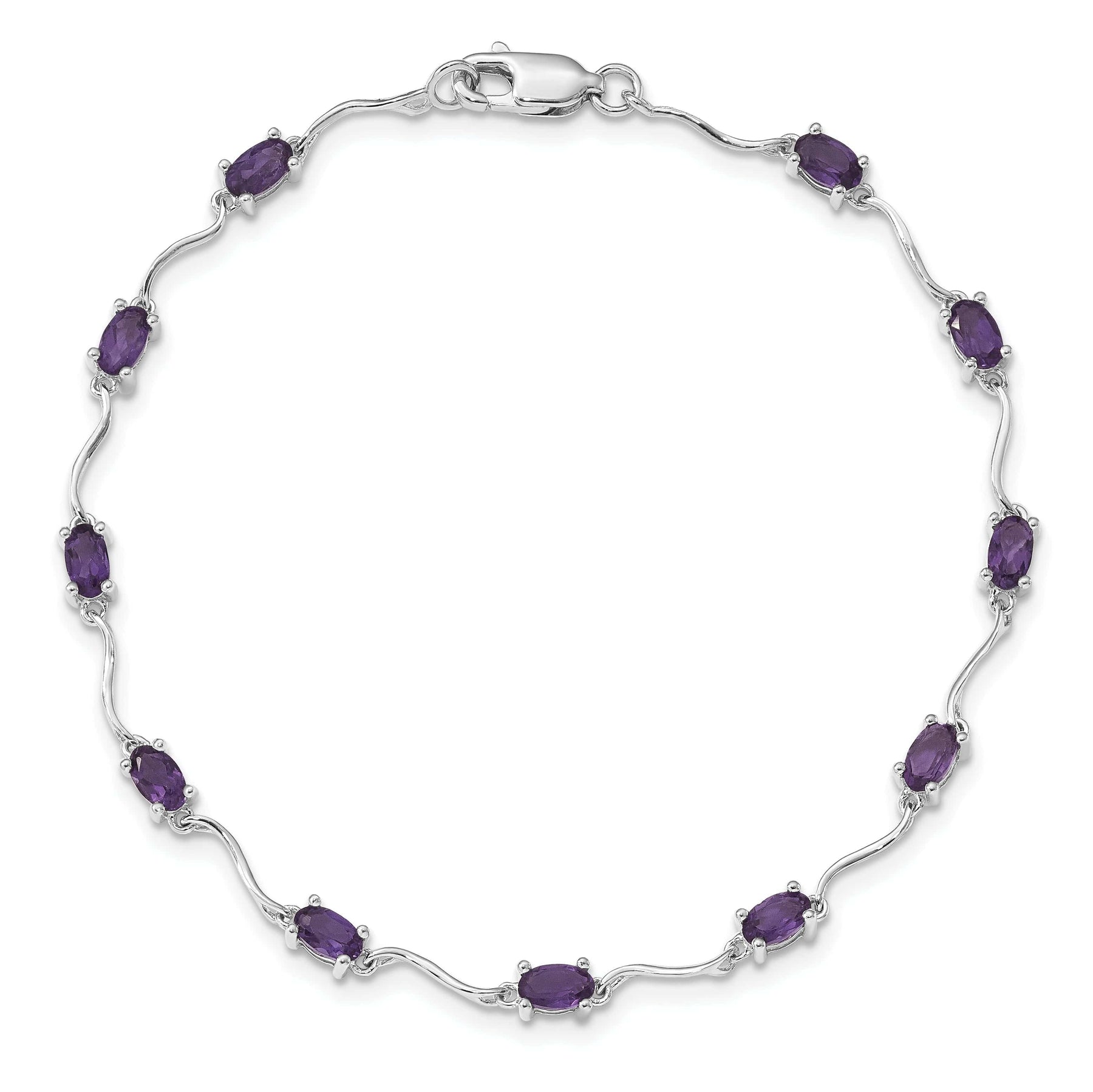 Introducing our stunning Sterling Silver Genuine Amethyst Gemstone Bracelet, a true symbol of luxury and elegance. This exquisite piece features a polished rhodium plated finish that gleams in the light, enhancing the natural beauty of the genuine amethyst gemstones adorning the bracelet. Each 5x3mm gemstone is carefully selected for its vibrant purple hue and remarkable clarity, totaling 2.5 carats of breathtaking beauty.