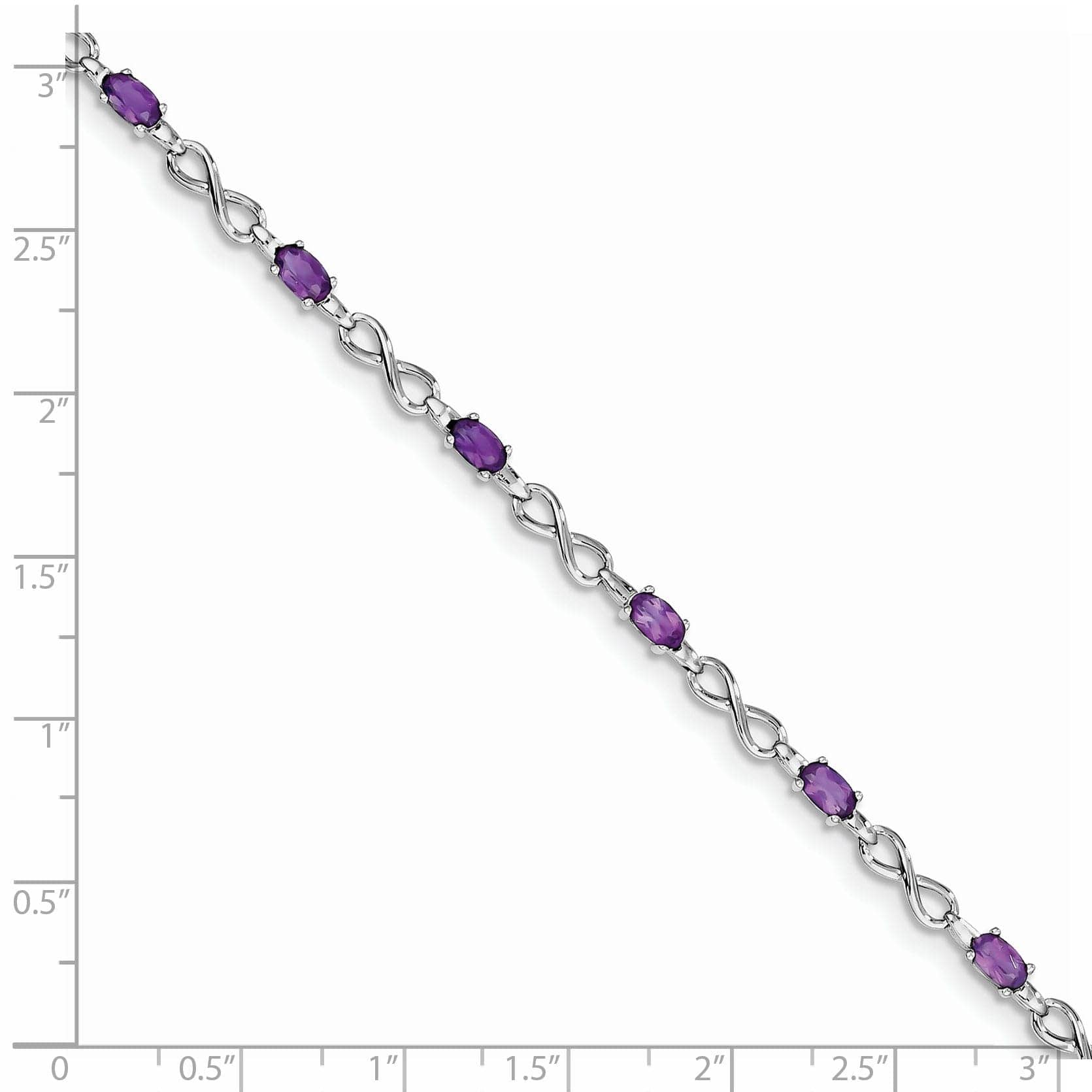 Enhance your jewelry collection with this exquisite Genuine Amethyst Gemstone Bracelet. Crafted from high-quality Sterling Silver with a Polished Rhodium Plated Finish, this bracelet is designed to dazzle and spark admiration. The 5x3-mm Oval Cut Genuine Amethyst Gemstones gleam with a total carat weight of 1.89, adding a touch of sophistication and elegance to any outfit.