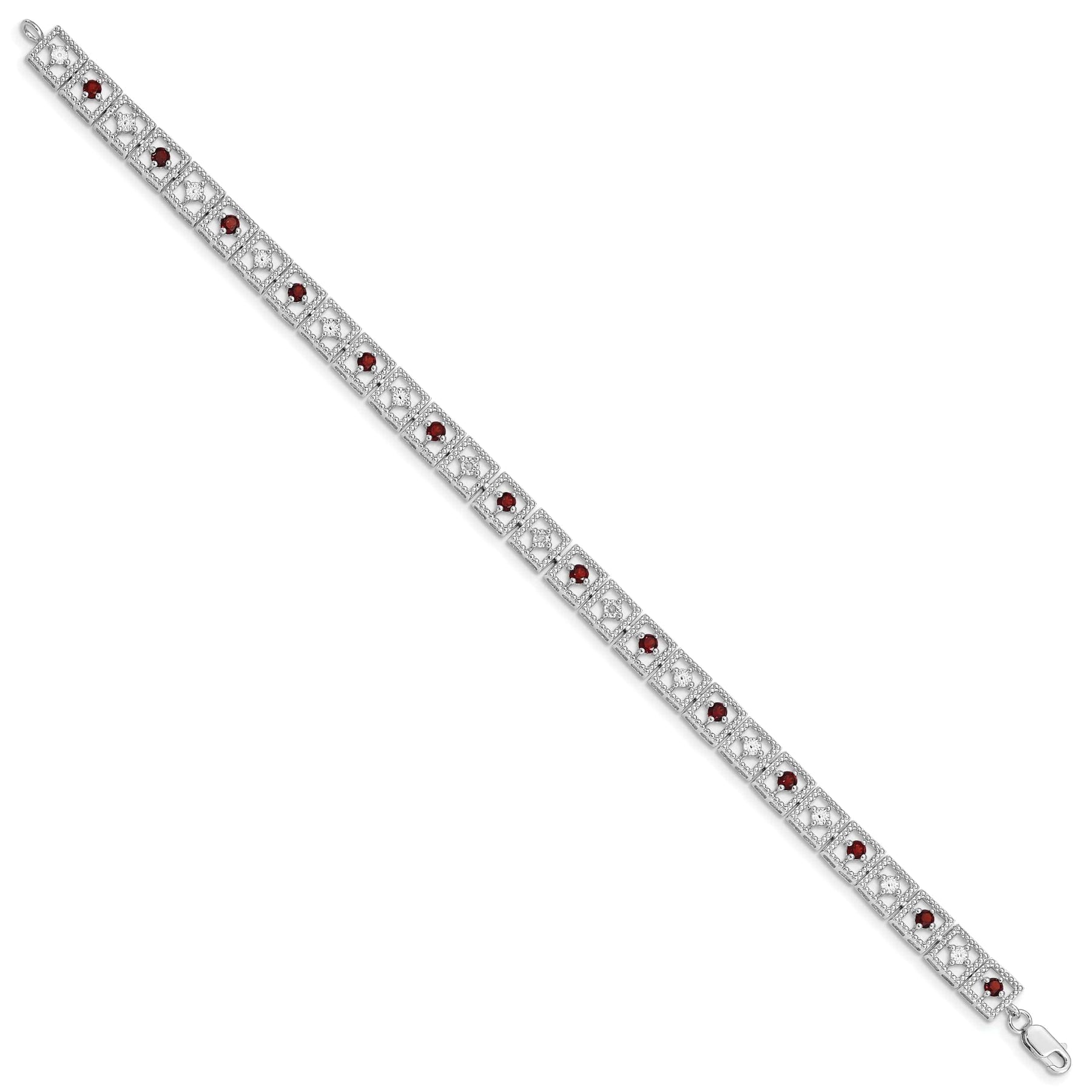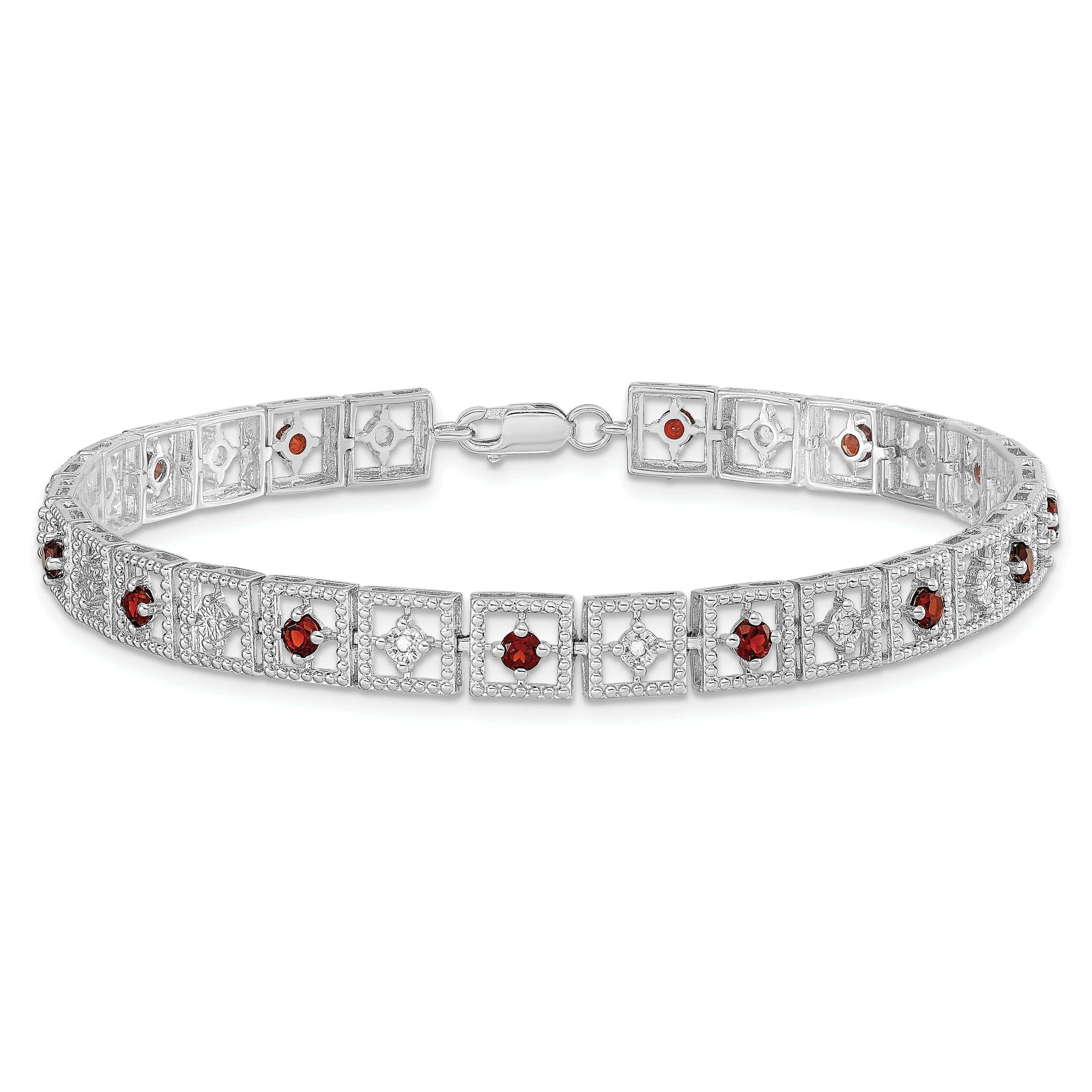 Elegance meets sophistication with this stunning Silver Round Diamond Garnet Gemstone Bracelet. Crafted with high-quality sterling silver, this bracelet features a polished finish and is rhodium plated for a lustrous shine. The textured design allows the brilliance of the 0.02-ctw round diamond, showcasing an i2 clarity and I-J color, to truly shine.